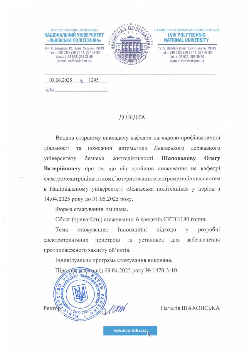 У 2025 році пройшов стажування на кафедрі електромехатроніки та комп’ютерних електромеханічних систем Національного університету «Львівська політехніка»