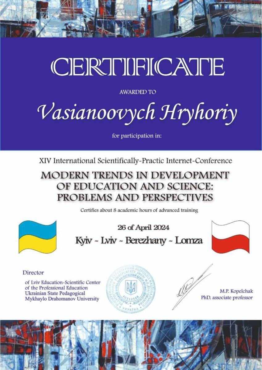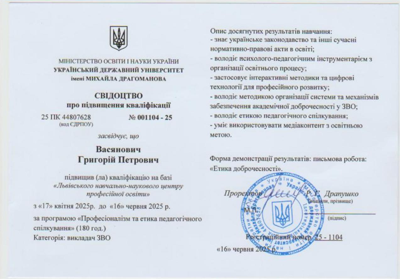 - Український державний університет імені Михайла Драгоманова, Львівський навчально-науковий центр професійної освіти (17.04.2025 р. – 16.06.2025 р.); свідоцтво про підвищення кваліфікації № 001104-25. Тема: «Професіоналізм та етика педагогічного спілкування» (180 год).