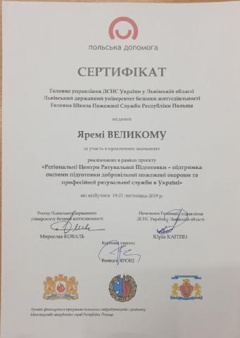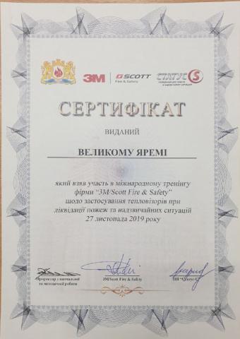 У 2019 році взяв участь у Міжнародному тренінгу фірми «3М Scott Fire & Safety» щодо застосування тепловізорів при ліквідації пожеж та надзвичайних ситуацій (м. Львів, Україна).