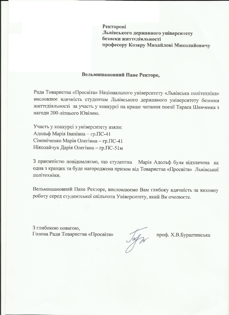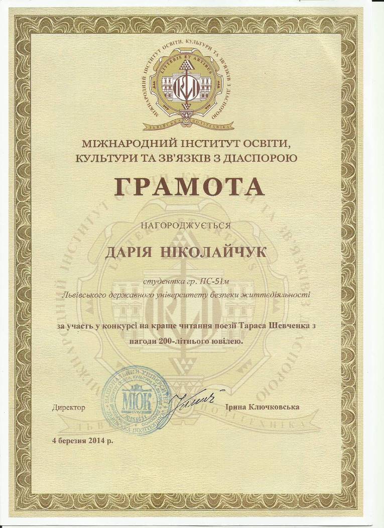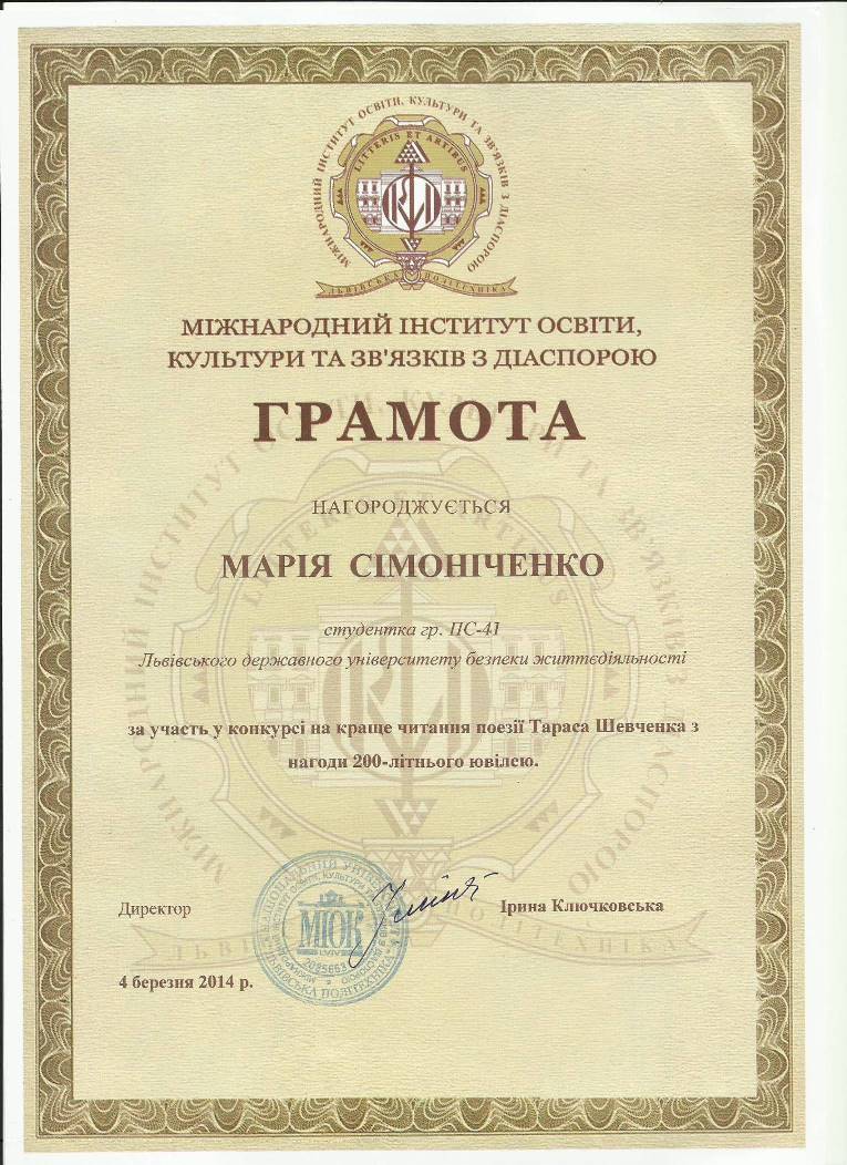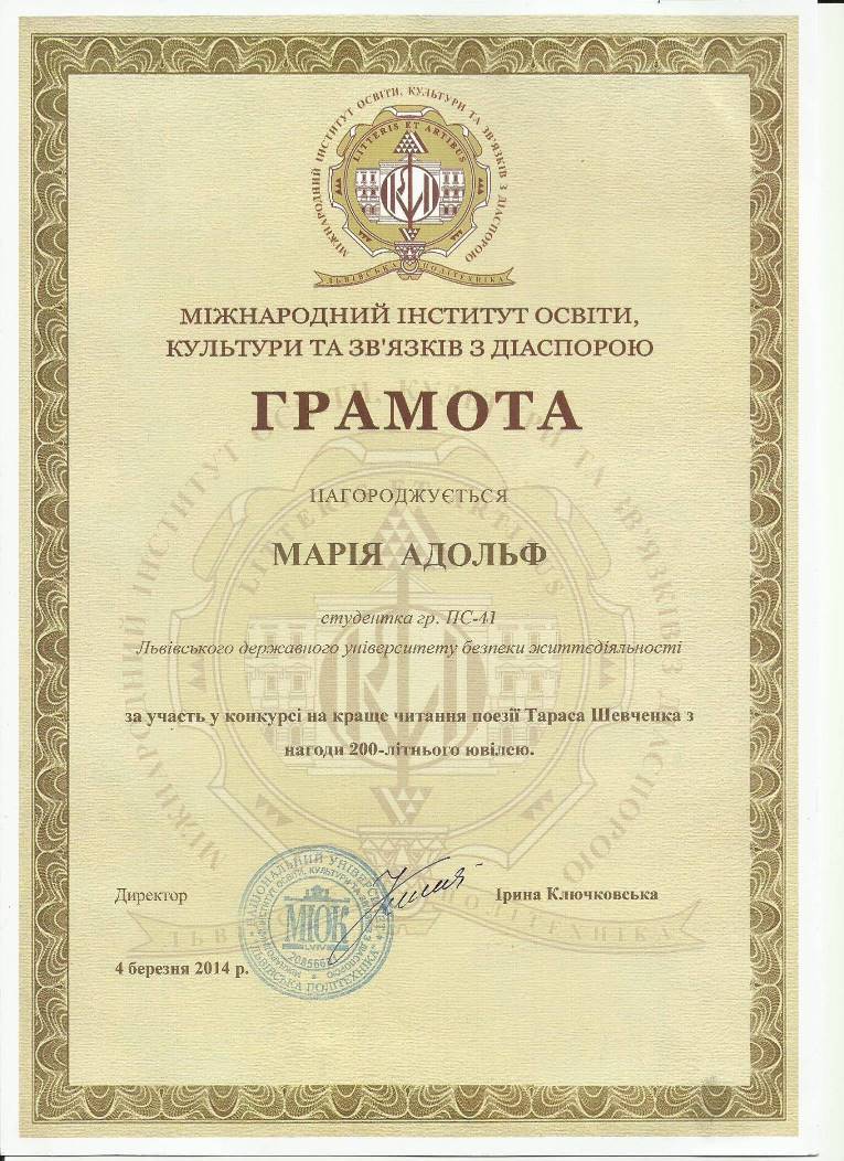 4 березня 2014 року в Національному університеті «Львівська політехніка» відбувся конкурс на краще читання поезії Тараса Шевченка, з нагоди 200-літнього Ювілею, в якому також брали участь троє курсантів інституту психології та соціального захисту Львівського державного університету безпеки життєдіяльності, а саме Марія Адольф, Марія Сімоніченко та Дарія Ніколайчук, 12 відбулось підведення підсумків і нагородження переможців і всі вони нагороджені грамотами, a такакож Марія Адольф та Марія Сімоніченко нагороджені цінними подарунками (книги та квитки в театр).