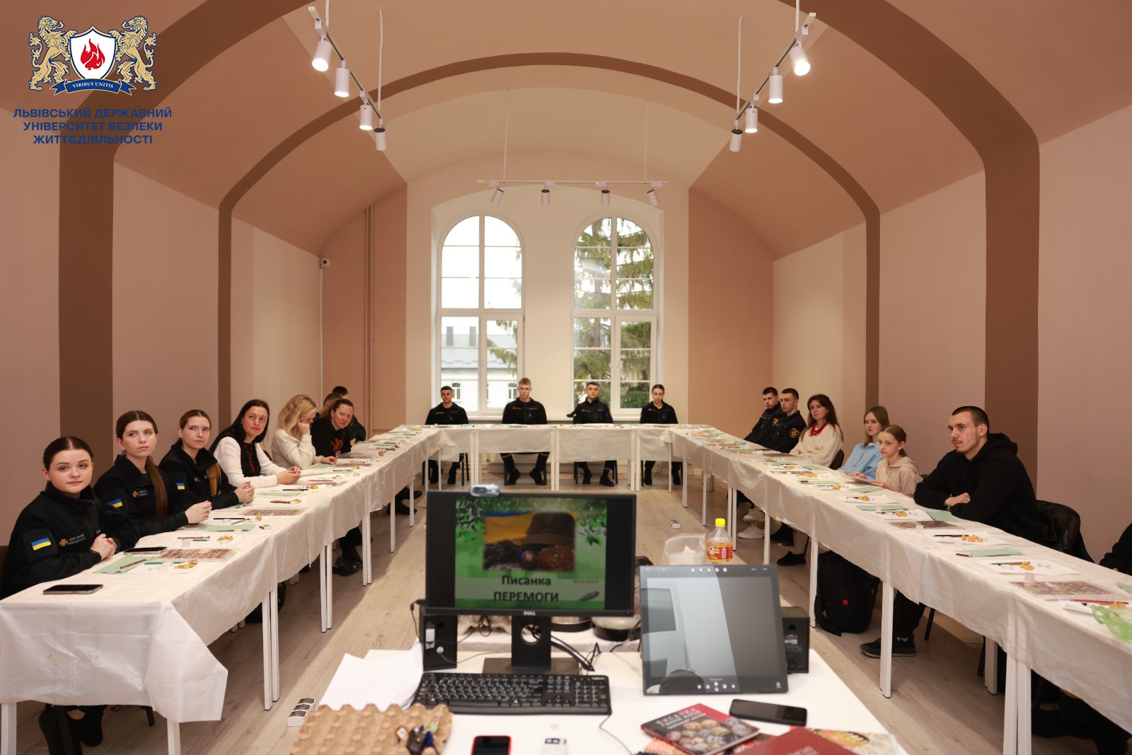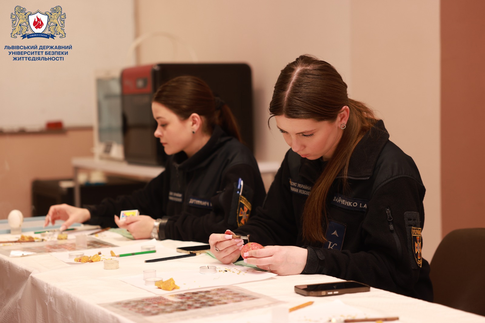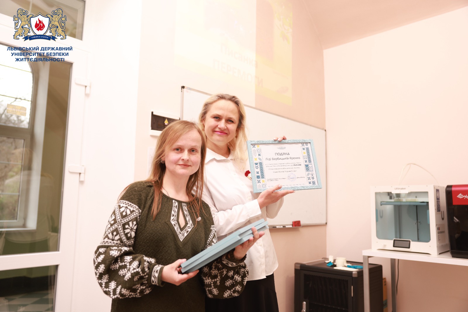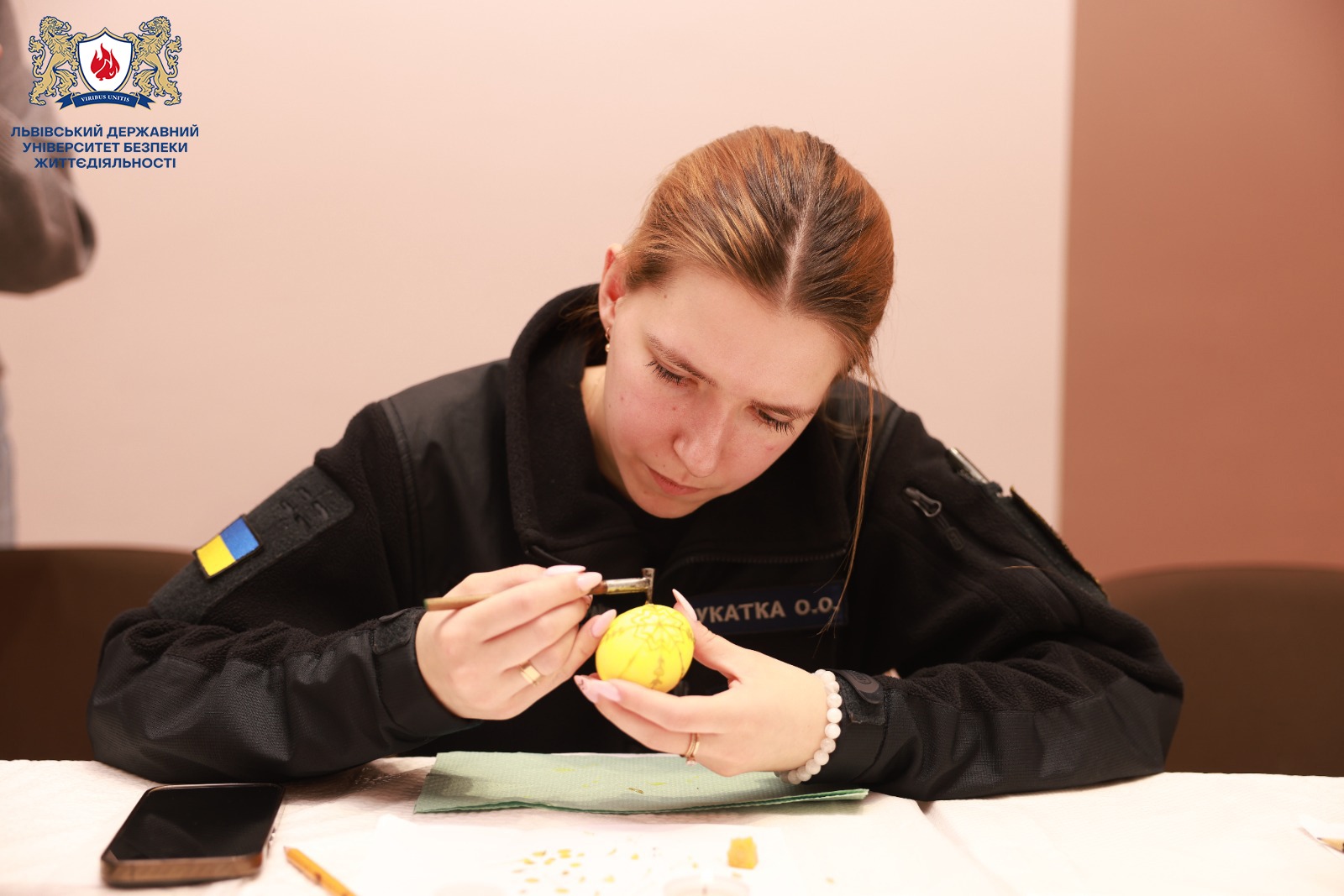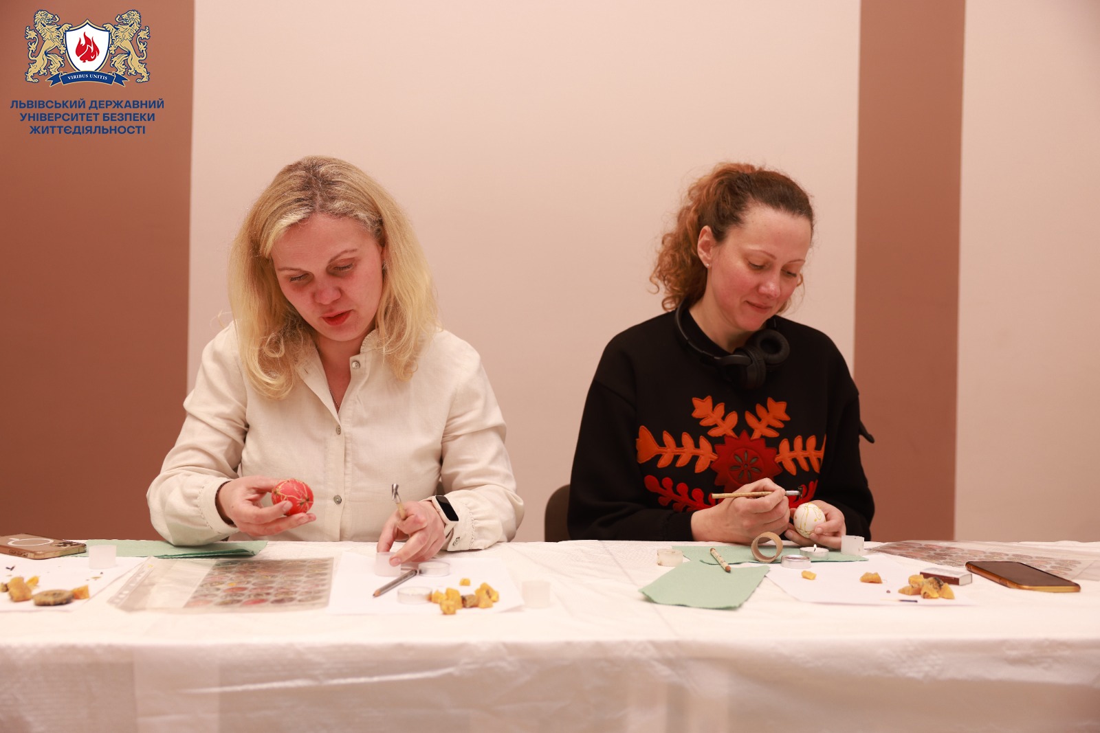 Щороку в нашому університеті відбувається традиційне передвеликоднє писанкування. Останнє десятиріччя навчає наших курсантів, студентів, офіцерів та викладачів правильно володіти писачком кандидат філологічних наук, керівниця волонтерської організації «Львів-Опір», майстриня Ірина КМЕТЬ. Цьогоріч Ірина Федорівна вручила «Подяки за особисту участь у боротьбі за Незалежність України, підтримку діяльности волонтерського руху Львів-Опір» керівництву та працівникам університету.