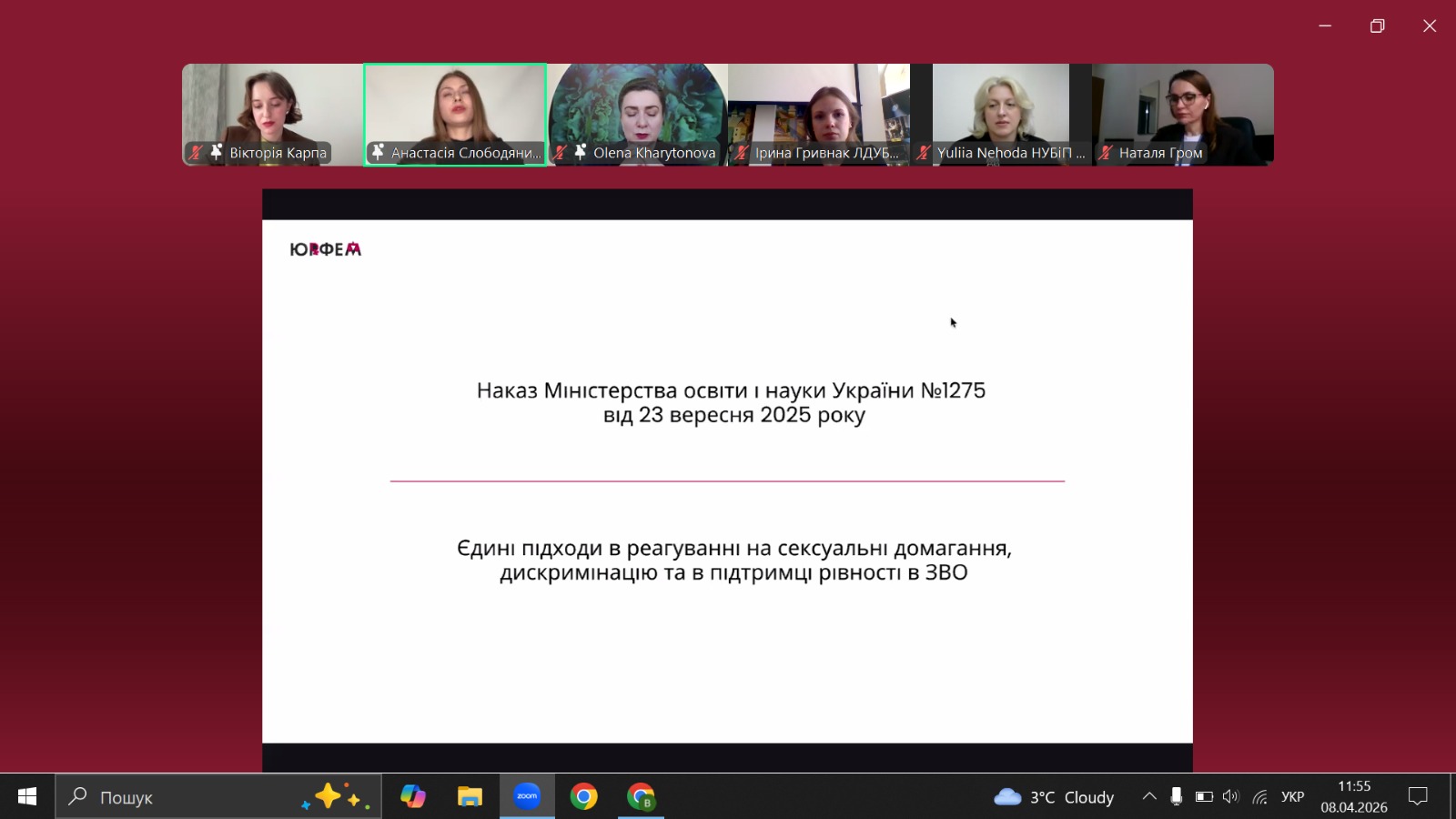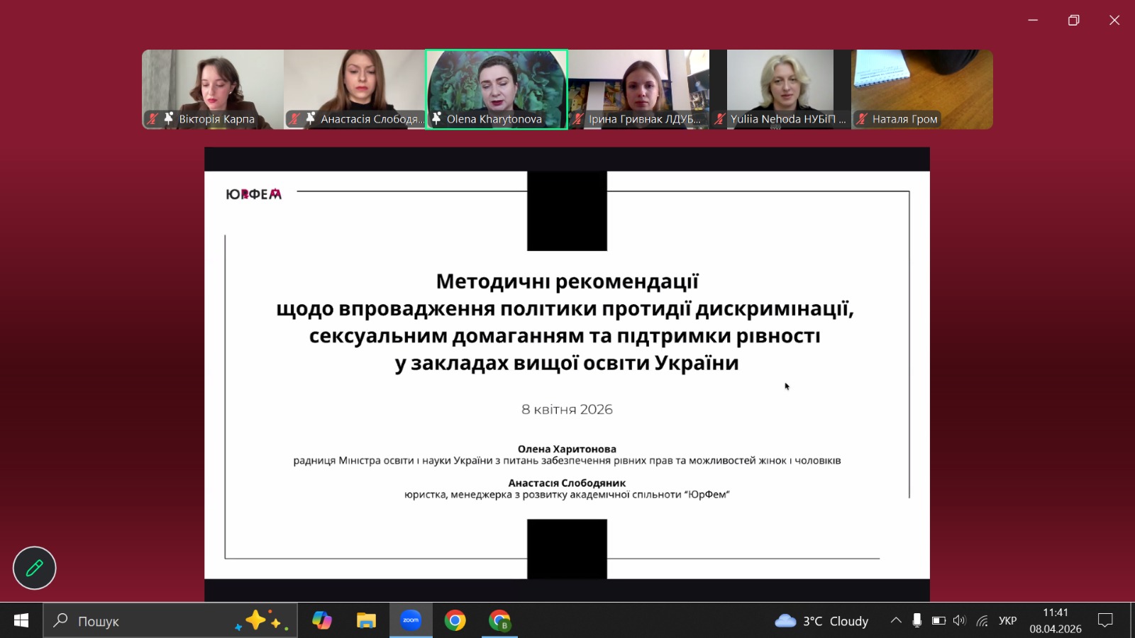 Учасники обговорили впровадження методичних рекомендацій щодо протидії дискримінації та сексуальним домаганням у закладах вищої освіти, а також практичні кроки щодо формування безпечного, інклюзивного та гендерно чутливого освітнього середовища.