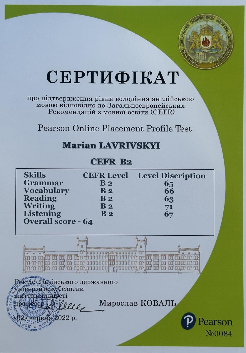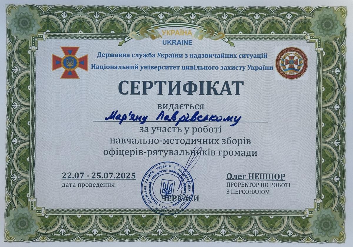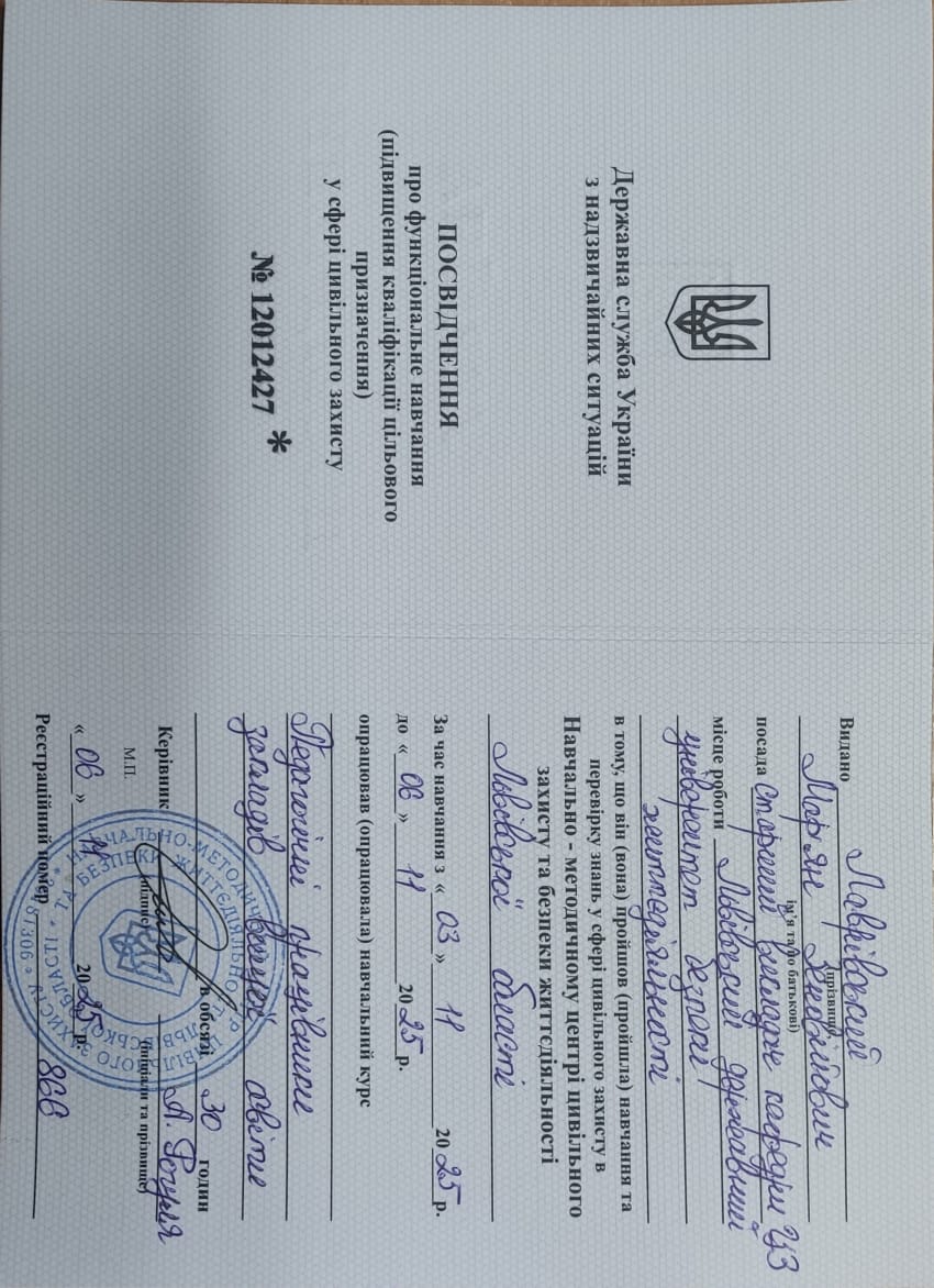 2022 р. – завершено навчання за спеціальністю 263 «Цивільний захист» ступеня вищої освіти магістр. 2022 р. -склав іспит та отримав сертифікат про підтвердження рівня володіння англійською мовою відповідно до Загальноєвропейських Рекомендацій з мовної освіти (CEFR Pearson Online Placement Profile Test) Основні публікації: