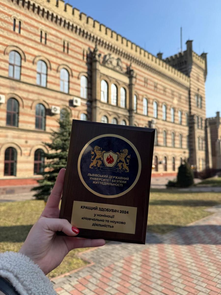 Відповідно до Положення про рейтингування та заохочення здобувачів вищої освіти Львівського державного університету безпеки життєдіяльності студенту наукового товариства кафедри ПАВЛОВСЬКУ Діану Тарасівну визнано Кращим здобувачем освіти 2024 року Львівського державного університету безпеки життєдіяльності у номінації "Навчальна та наукова діяльність"