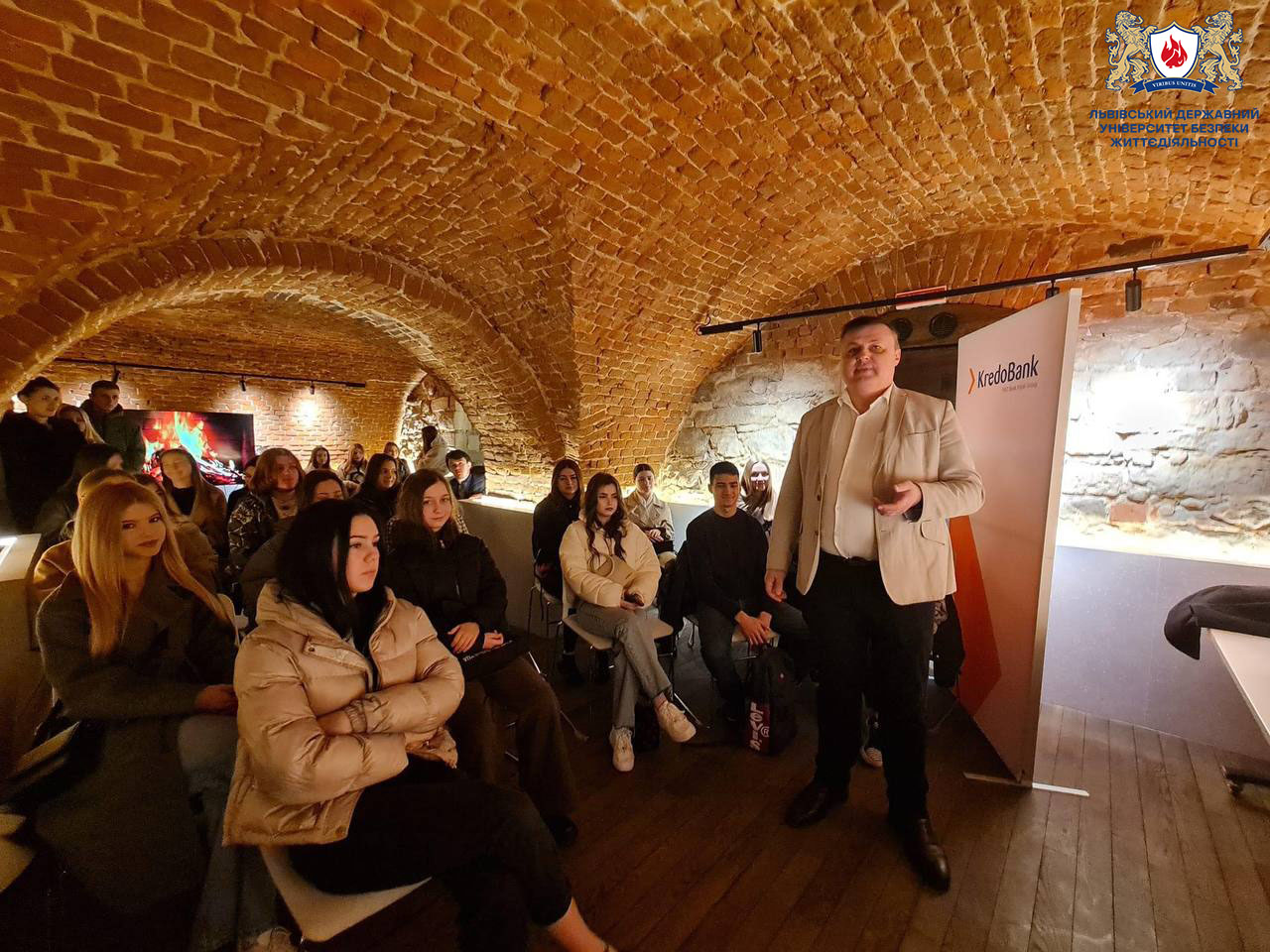 У межах заходів Global Money Week(Всесвітнього тижня грошей) проведено бінарне виїзне практичне заняття на базі стейкхолдера кафедри права та менеджменту у сфері цивільного захисту АТ «Кредобанк». Заняття проводили для здобувачів вищої освіти спеціальності «Менеджмент», поєднуючи освітні компоненти «Фінанси, гроші та кредит» (лектор – Руслана СОДОМА) та «Менеджмент безпеки» (лектор – Ігор СТЕЦІВ). Обрано цікаву тему: «Фінансова безпека банків в умовах воєнного стану», до обговорення якої долучився директор департаменту комунікацій АТ «Кредобанк» Віктор ГАЛЬЧИНСЬКИЙ, який надав корисні поради щодо основ онлайн-безпеки та протидії кібершахрайствам у фінансовій сфері, а також наголосив на тому, що гарантування безпеки банків в Україні має здійснюватися також на рівні окремого банку на підставі реалізації заходів банківського менеджменту. Цікава альтернатива парам в авдиторії, адже покращує soft skills, сприяє розвитку аналітичних можливостей, активізує логічну та емоційну пам'ять, допомагає отримати фундаментальні теоретичні знання, які мають бути поєднані з практикою. Майбутній менеджер повинен монетизувати свої знання, які будують міцний фундамент для професійного становлення в сучасних умовах.