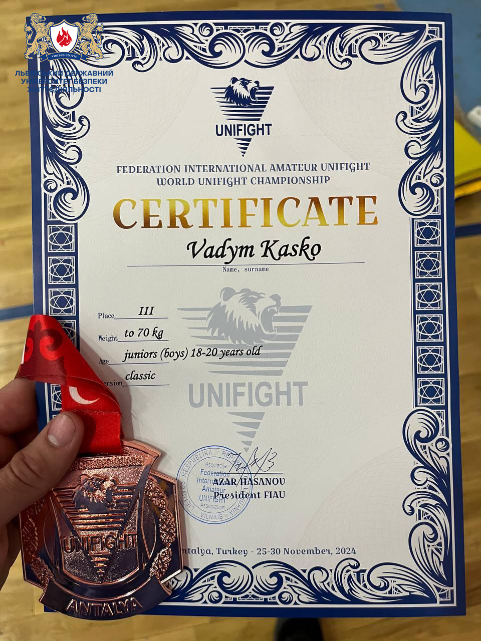 Днями курсант Львівського державного університету безпеки життєдіяльності Вадим Касько у складі Національної збірної України з універсального бою продемонстрував свою майстерність на Чемпіонаті світу з універсального бою, який відбувся у місті Кіріш (Туреччина).