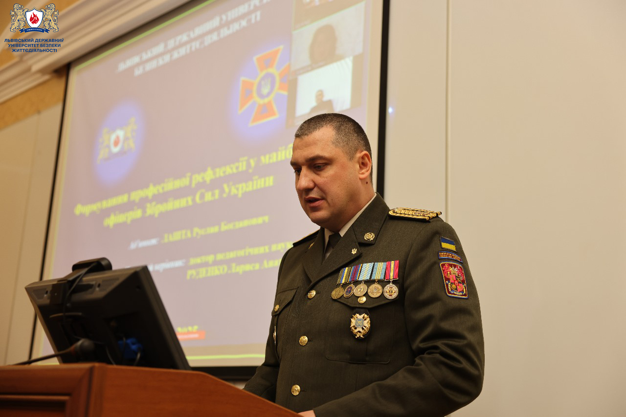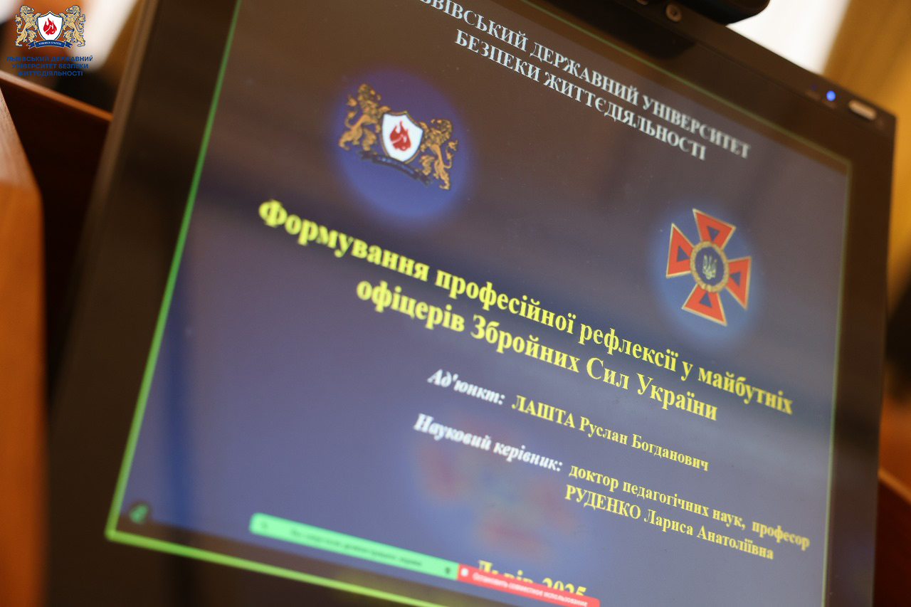 На засіданні разової спеціалізованої вченої ради 7278 (ДФ 35.874.024) Львівського державного університету безпеки життєдіяльності відбувся успішний захист дисертації ад’юнкта Руслана ЛАШТИ на здобуття ступеня доктора філософії з галузі знань 01 Освіта/Педагогіка за спеціальністю 015 Професійна освіта (за спеціалізаціями). Тема дисертації: «Формування професійної рефлексії у майбутніх офіцерів Збройних Сил України». Науковий керівник – Лариса РУДЕНКО, д.пед.н., професор, професор кафедри практичної психології та педагогіки.