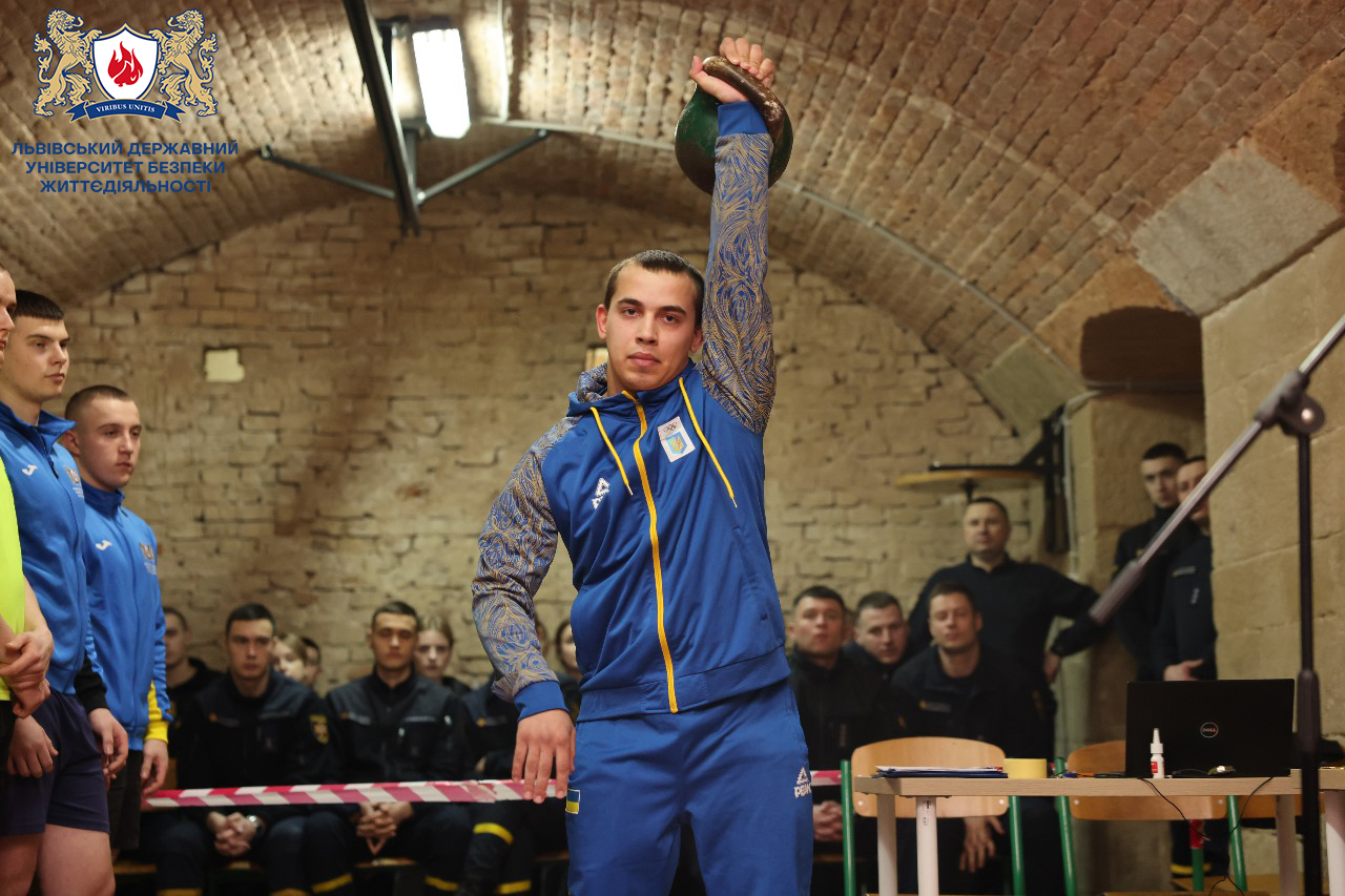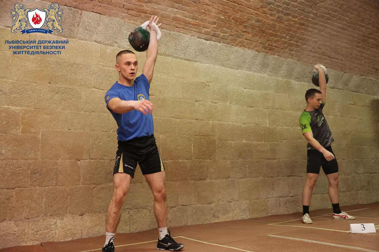 Сьогодні в спортивному залі єдиноборств Львівського державного університету безпеки життєдіяльності відбулись змагання з гирьового спорту. Ці змагання відбулись за програмою Спартакіади ЛДУБЖД 2024-2025 н.р. серед команд навчально-стройових підрозділів та проходили в рамках підготовки до Чемпіонату з гирьового спорту серед курсантів закладів вищої освіти, що належить до сфери управління Міністерства внутрішніх справ України. У змаганнях взяли участь 40 спортсменів з різних навчально стройових підрозділів. «Дуже крута атмосфера панувала протягом цих змагань, адже це перші змагання, які відбуваються в залі єдиноборств, а ще всі учасники хочуть показати свої найкращі результати» - зазначив курсант Назар.