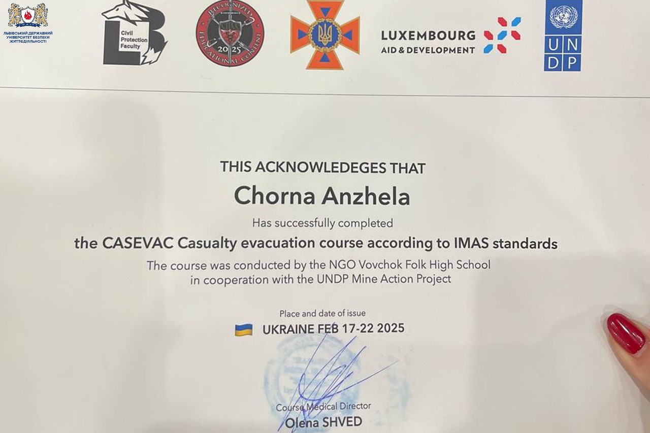 В період з 17 по 22 лютого 2025 року фельдшер медико-санітарної частини, сержант служби цивільного захисту Анжела Чорна успішно пройшла навчальний тренінг по роботі з медичним обладнанням, встановленим в автомобілях типу CASEVAC.