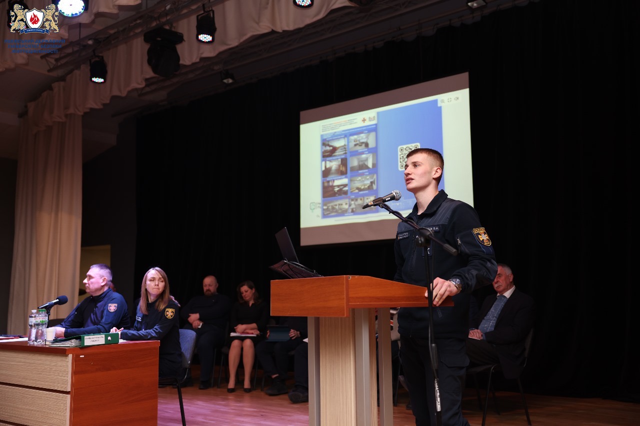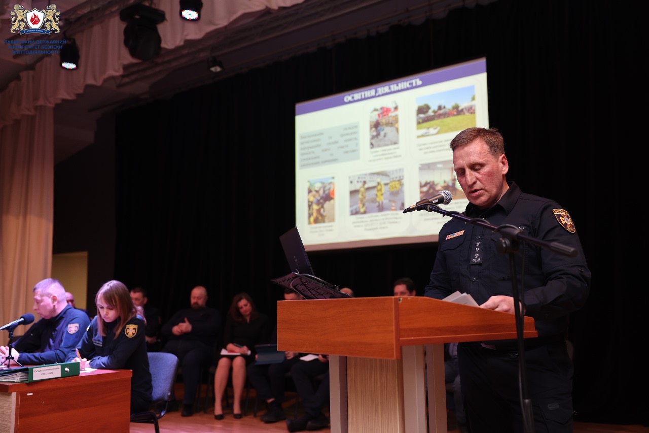 Учасники Конференції затвердили порядок денний, що передбачав розгляд трьох питань, першим з яких була доповідь ректора Університету генерал-майор служби цивільного захисту Дмитра БОНДАРЯ про результати роботи колективу Львівського державного університету безпеки життєдіяльності в 2024 році. У своїй доповіді Дмитро Володимирович відзначив значний поступ Університету у науковій, освітній, міжнародній царинах, відтак за підсумками 2024 р. наш навчальний заклад посідає високі місця у рейтингу ЗВО системи МВС України. З-поміж численних досягнень за звітний період Дмитро Бондар відзначив, що в ЛДУБЖД створено нові кафедри, лабораторії, започатковано нові освітні програми безпекового спрямування, розроблено інтерактивний проєкт - систему оповіщення та реагування «Я Доброволець», запроваджено рейтингування здобувачів освіти, що мотивує їх навчальну, наукову, спортивну активність, про що свідчать призові місця курсантів і студентів ЛДУБЖД у наукових конкурсах та спортивних змаганнях. Упродовж 2024р. також відбулась низка міжнародних, всеукраїнських науково-практичних конференцій, безпекових тренінгів, реалізовані актуальні в умовах воєнних викликів ініціативні науково-дослідні теми.