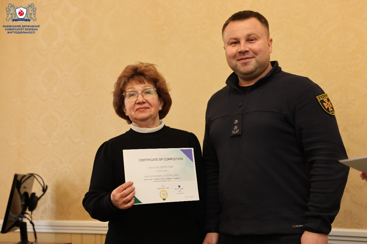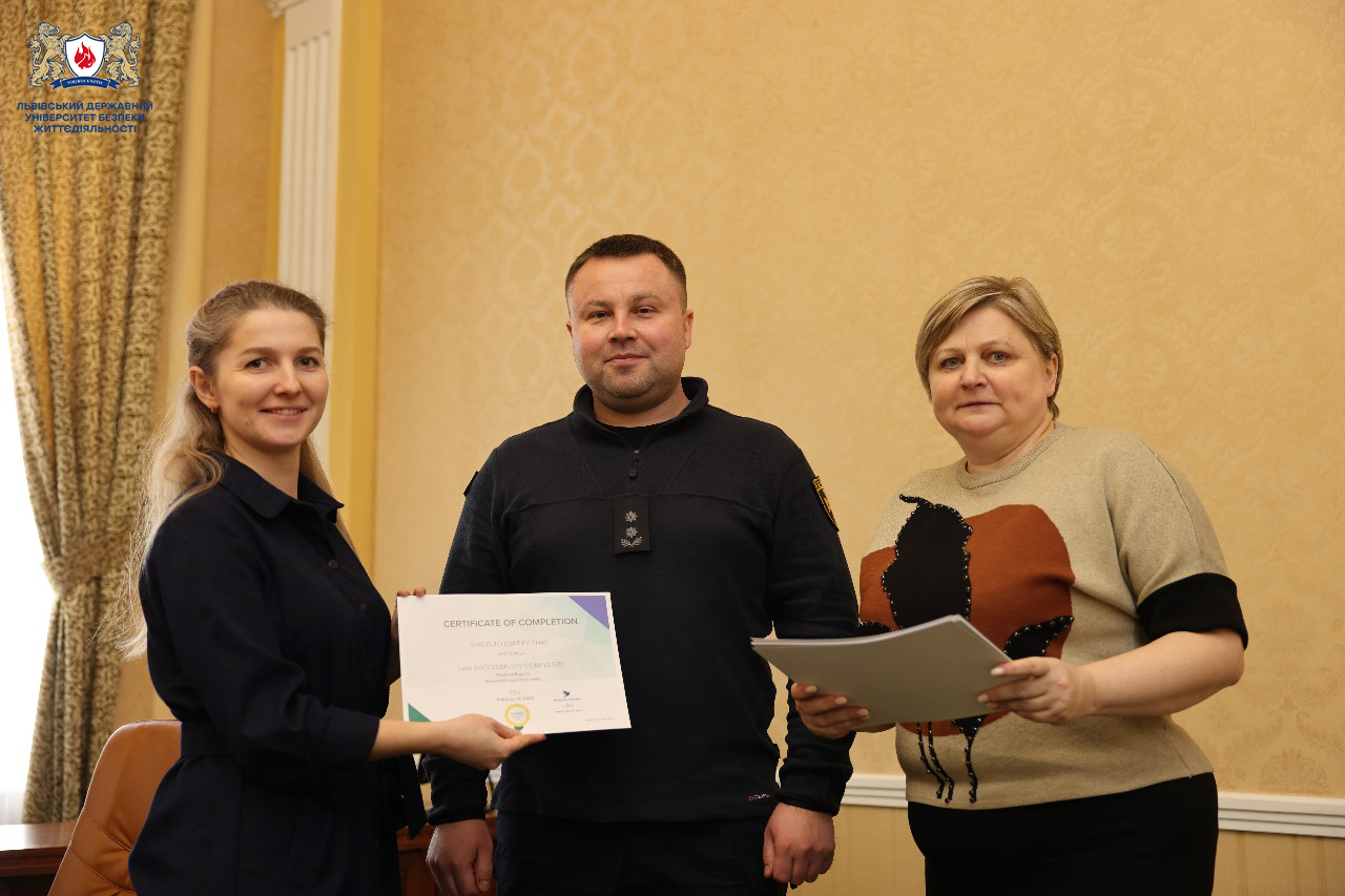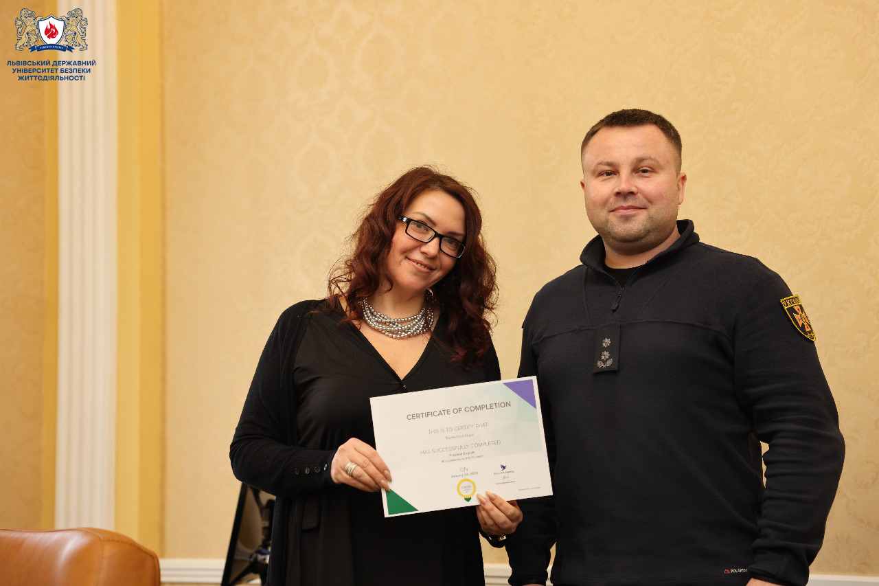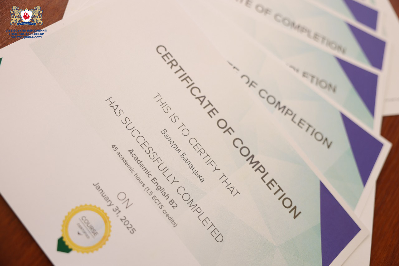 Сьогодні в межах реалізації проєкту English4Ukraine Маріупольського державного університету викладачі та ад’юнкти факультету цивільного захисту Львівського державного університету безпеки життєдіяльності отримали сертифікати про успішне завершення курсів англійської мови. Ініціатива реалізована та активно підтримується кафедрою іноземних мов та перекладознавства Університету, зокрема координатором проєкту від нашого університету Олександрою Пальчевською. Курси вивчення англійської мови у такому форматі розпочались в осінньому семестрі поточного навчального року і тривали 90 днів, викладачі та здобувачі мали можливість обрати курс, який відповідає їхньому рівню та інтересам, зокрема Academic English, Practical English, Writing for Business тощо. Реалізацію проєкту продовжено на весняний семестр, долучитися можуть всі охочі здобувачі, працівники та викладачі Університету.
