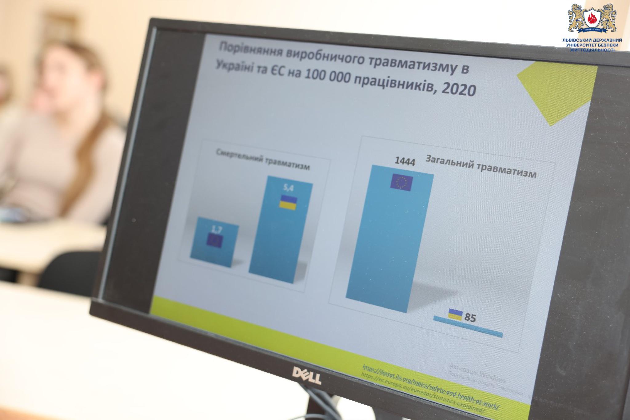 Під час зустрічі було розглянуто актуальні питання: відмінності та спільні риси законодавства України та ЄС у сфері безпеки праці, а також євроінтеграційний шлях нашої держави. Світові програми з безпеки праці: можливості та перспективи для України. Майбутнє цивільного захисту, безпеки та здоров’я на роботі з урахуванням воєнного досвіду. Найактивніші студенти отримали під час лекції приємні заохочувальні призи.