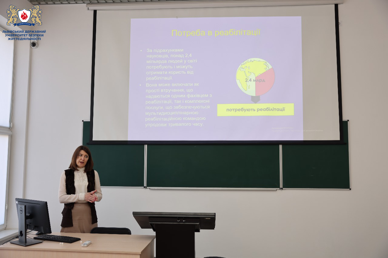 У рамках співпраці між Львівським державним університетом безпеки життєдіяльності (кафедрою домедичної підготовки) та Львівським національним медичним університетом імені Данила Галицького відбулася лекція завідувача кафедри реабілітації факультету післядипломної освіти ЛНМУ, доцента Макар Оксани Романівни.