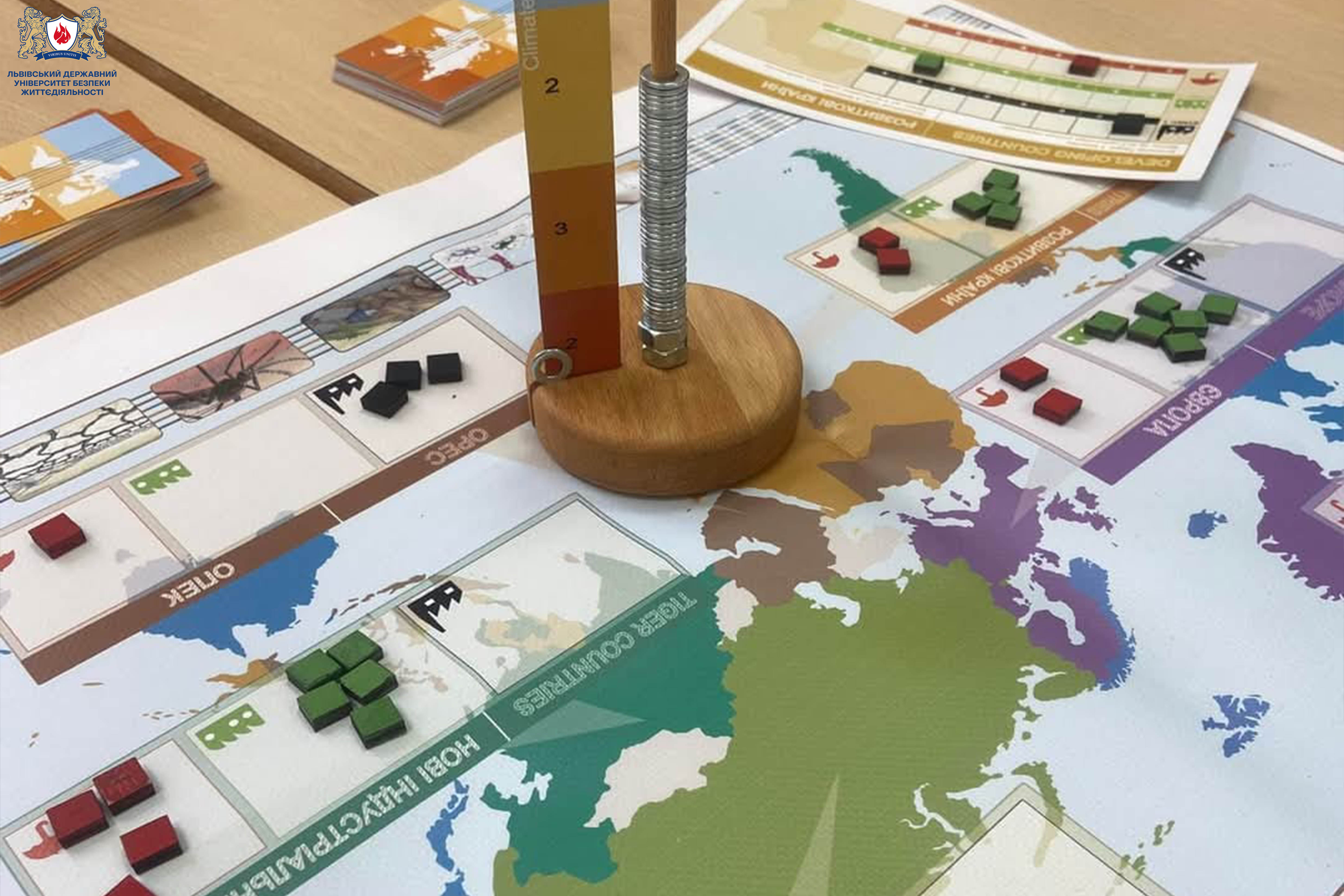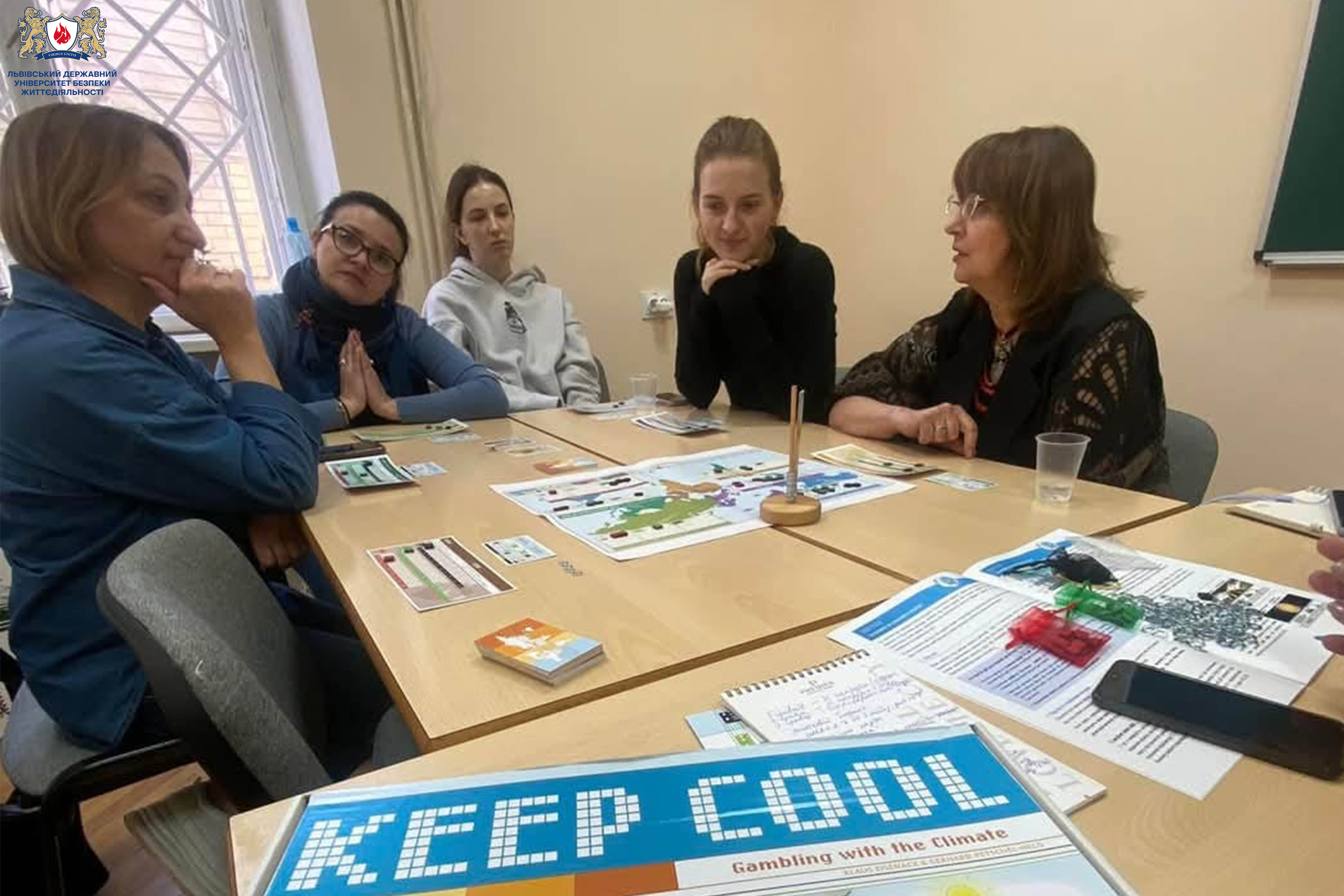 Серед учасників була старша викладачка кафедри екологічної безпеки Наталія ГОЦІЙ. Дякуємо Українському екологічному клубу "Зелена хвиля" за безцінний подарунок — гру, яка тепер стане важливим інструментом у навчальному процесі для студентів-екологів ЛДУ БЖД. Цей формат гейміфікації дозволить майбутнім фахівцям ефективно досліджувати стратегічні рішення щодо подолання кліматичних змін і засвоювати важливі екологічні принципи в інтерактивній формі.