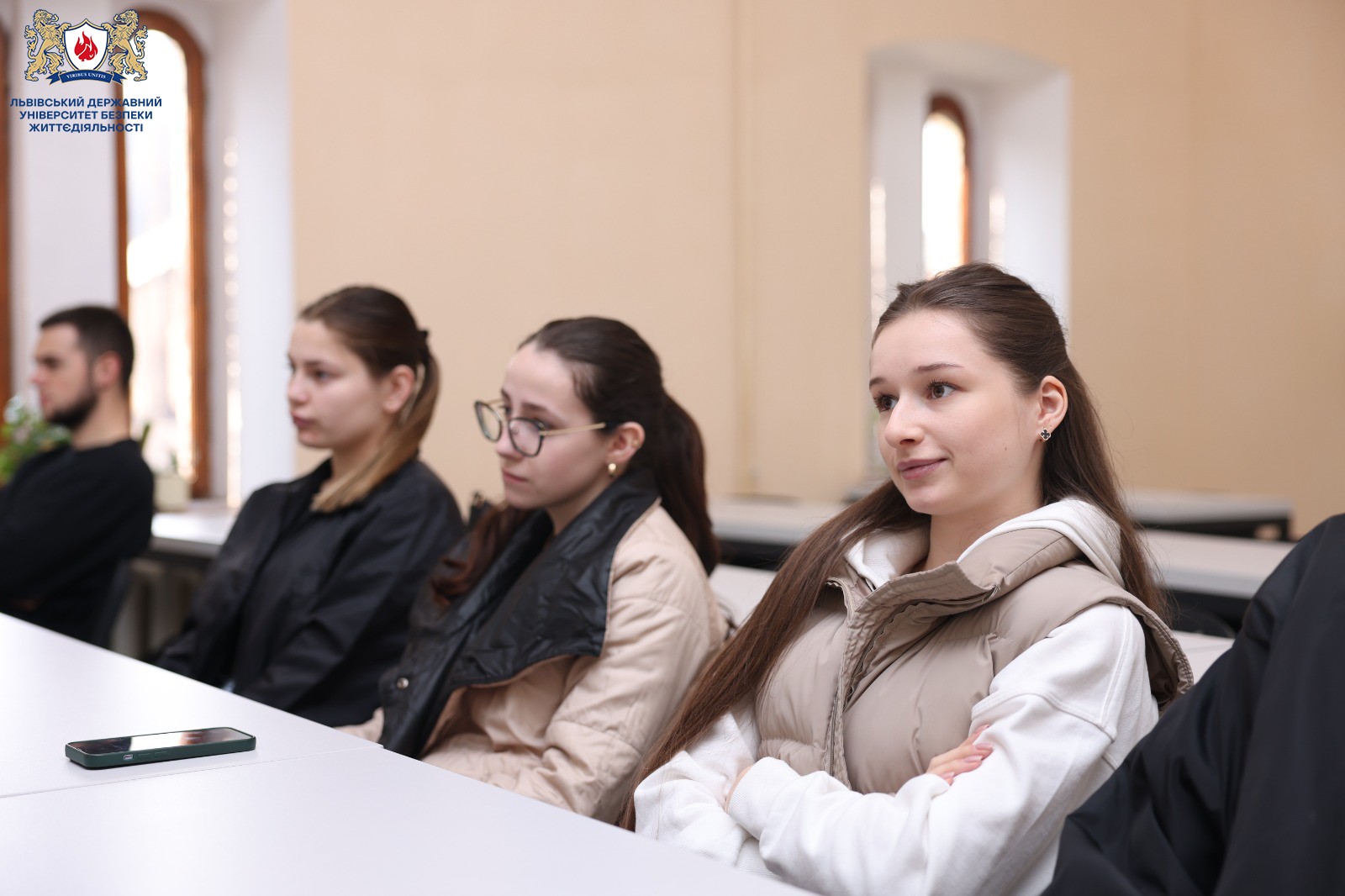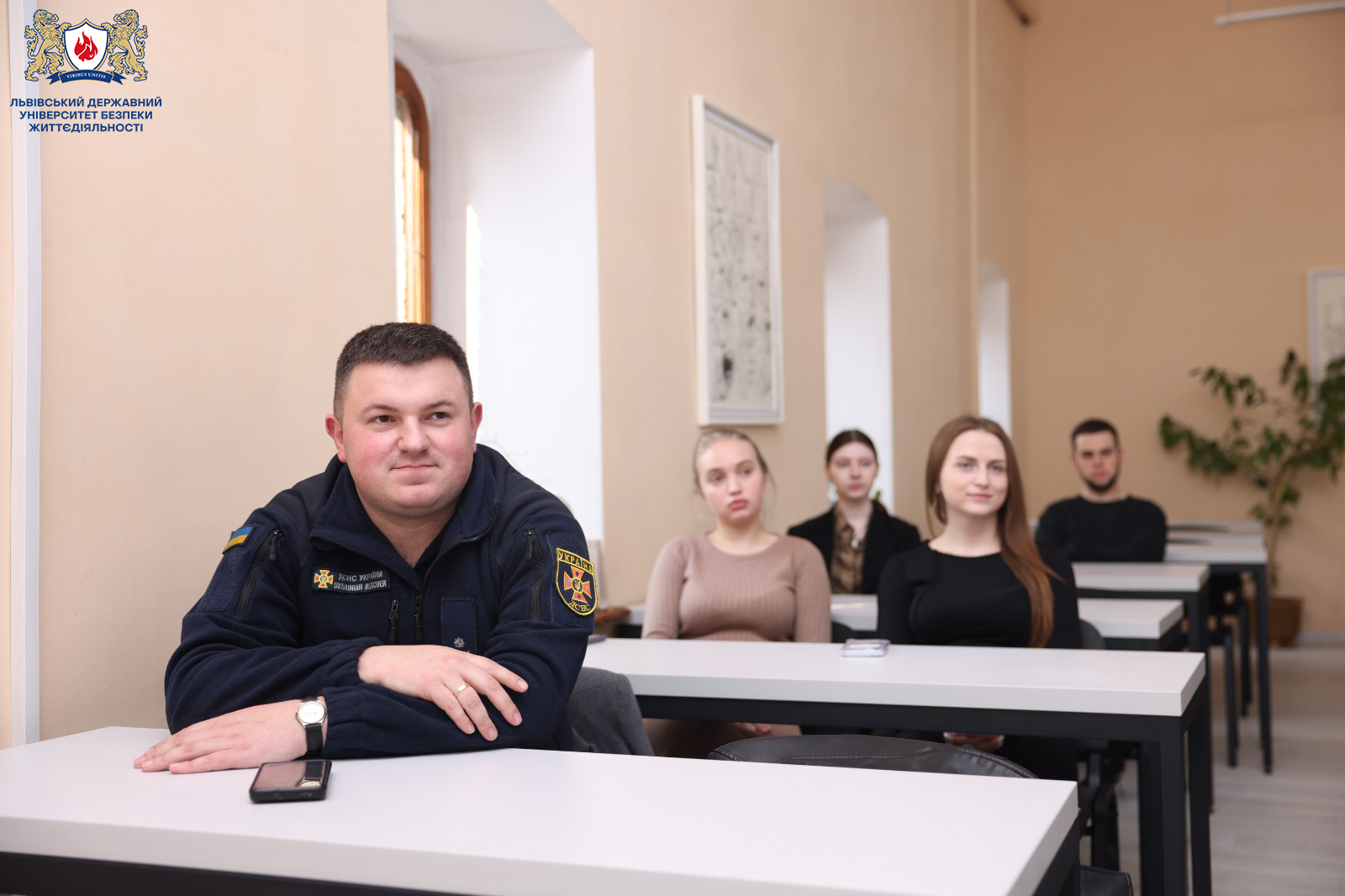 У Львівському державному університеті безпеки життєдіяльності відбулась гостьова лекція для здобувачів вищої освіти спеціальності 053 Психологія на тему «Етика спілкування з ветеранами». Зустріч відбулась в межах вивчення курсу «Військова психологія». Лекцію провели фізична терапевтка реабілітаційного центру «Незламні» (UNBROKEN) Роксоляна ШМІЛО та ветеран війни Євген ШВАБ.