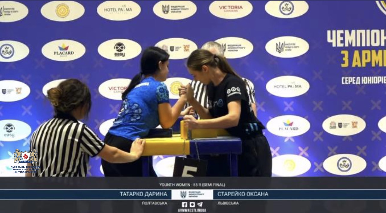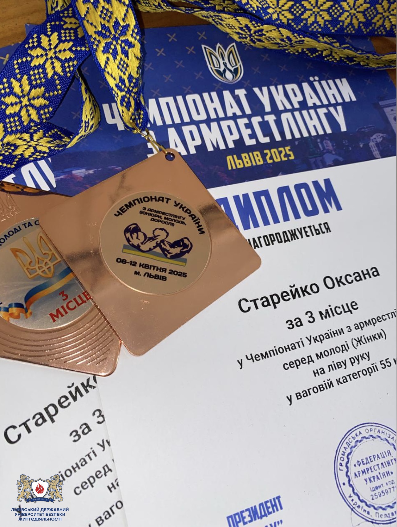 За підсумками чемпіонату курсантка 3-го курсу факультету психології та соціального захисту Старейко Оксана продемонструвала високий рівень підготовки та волі до перемоги. Вона виборола дві бронзові медалі, посівши 3 місце у ваговій категорії до 55 кг серед молоді (жінки) — як у змаганнях на праву, так і на ліву руку.Це досягнення стало вагомим внеском у спортивну славу закладу та є яскравим прикладом поєднання навчання і професійного спорту.