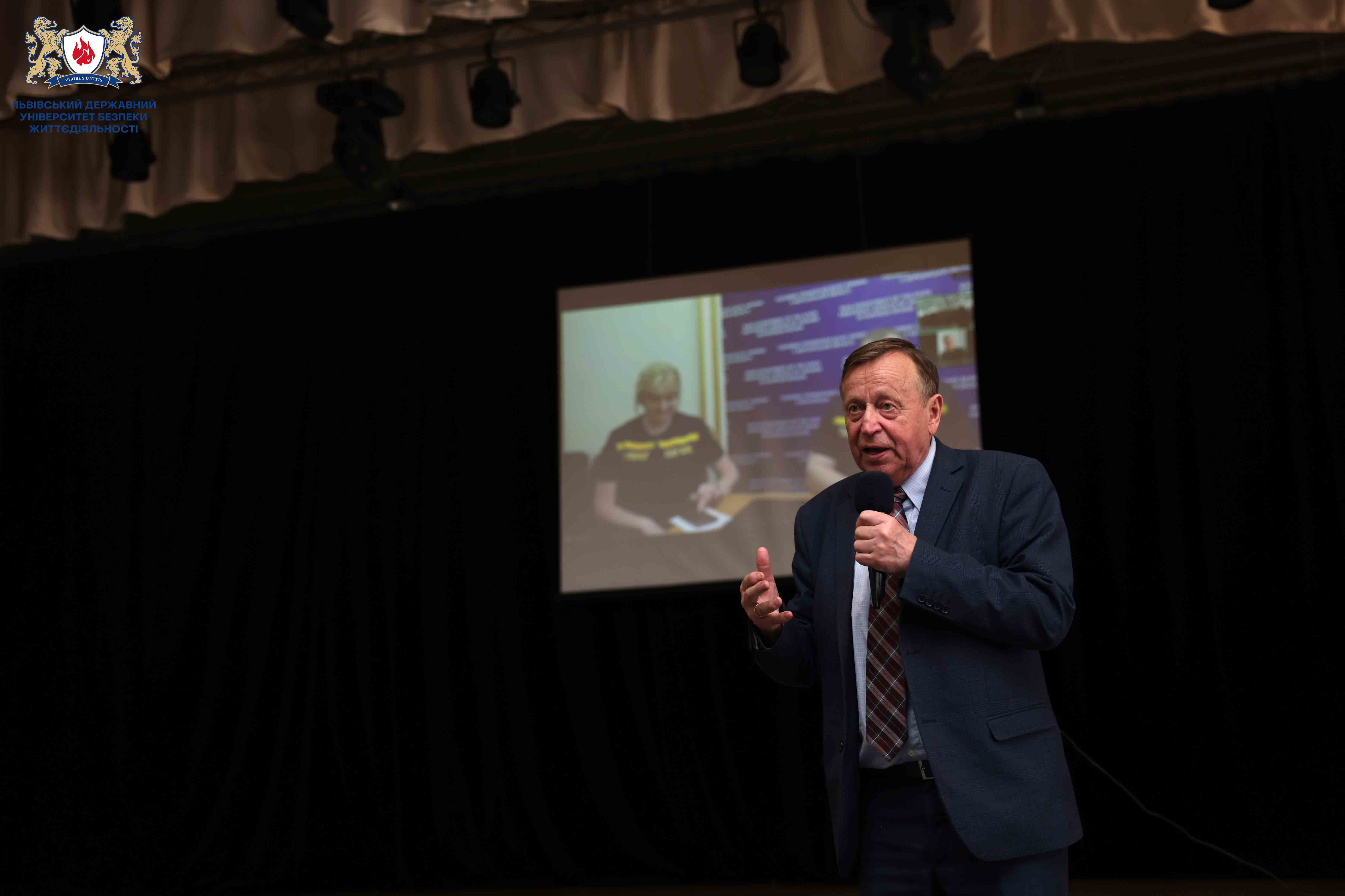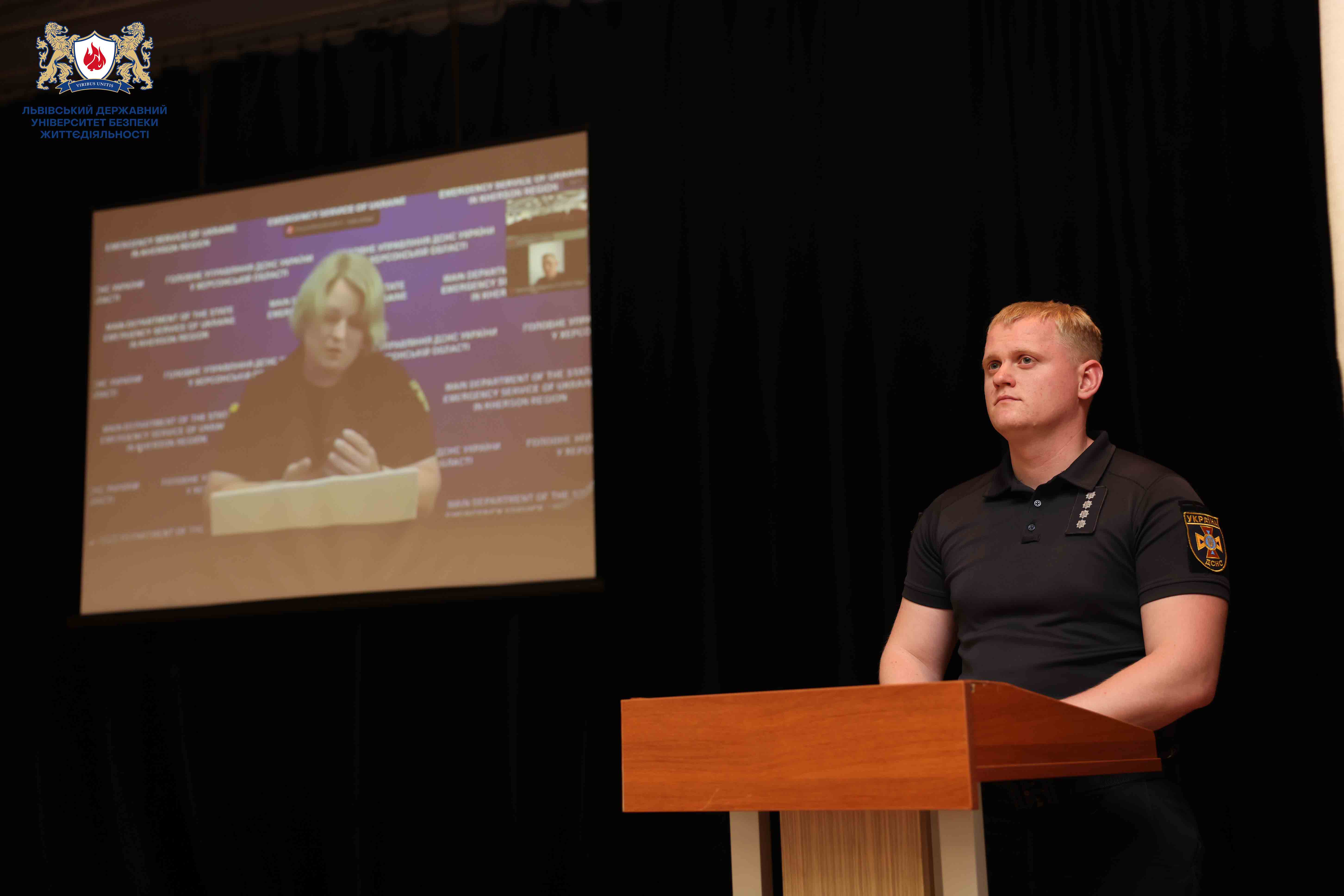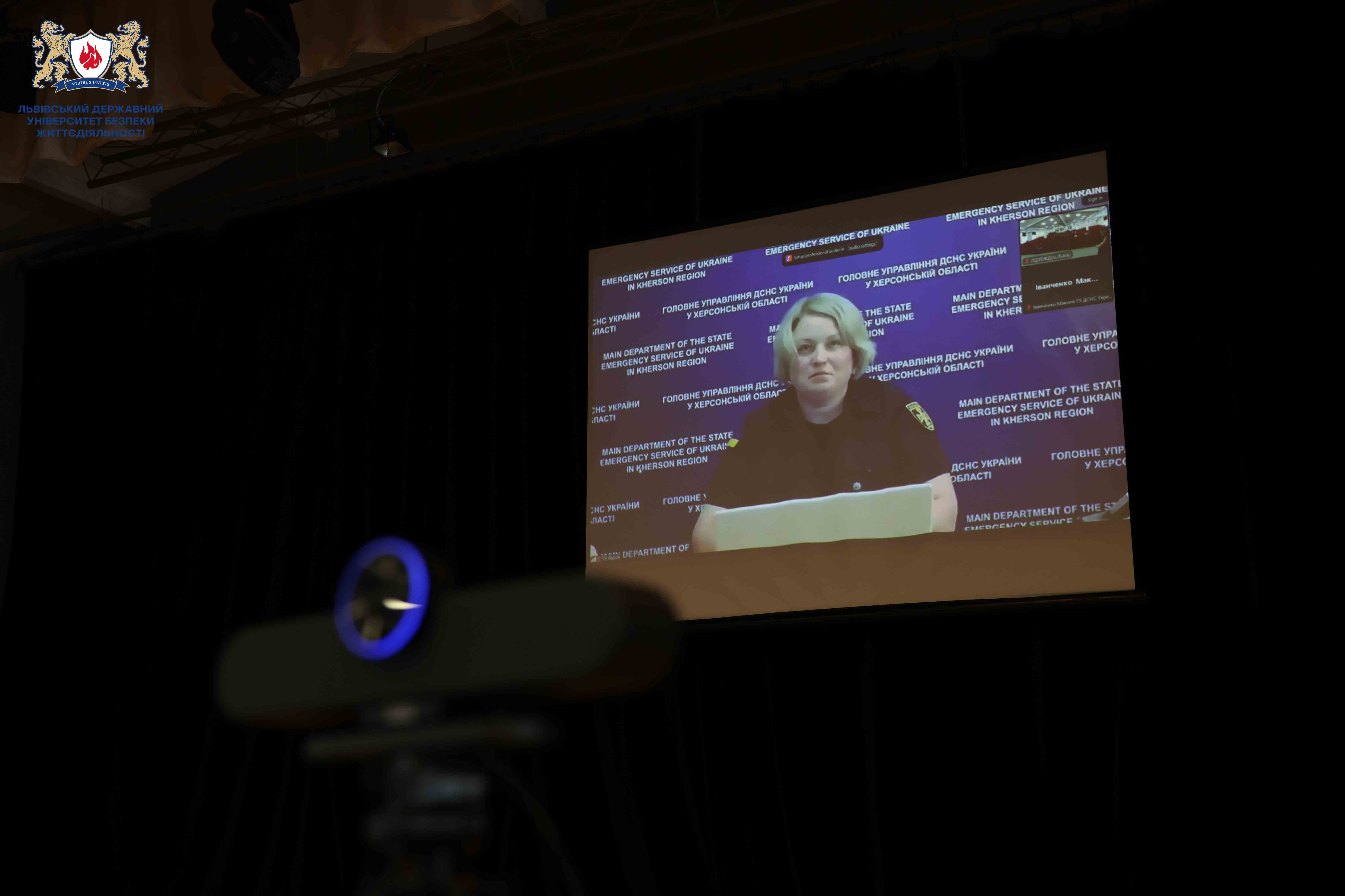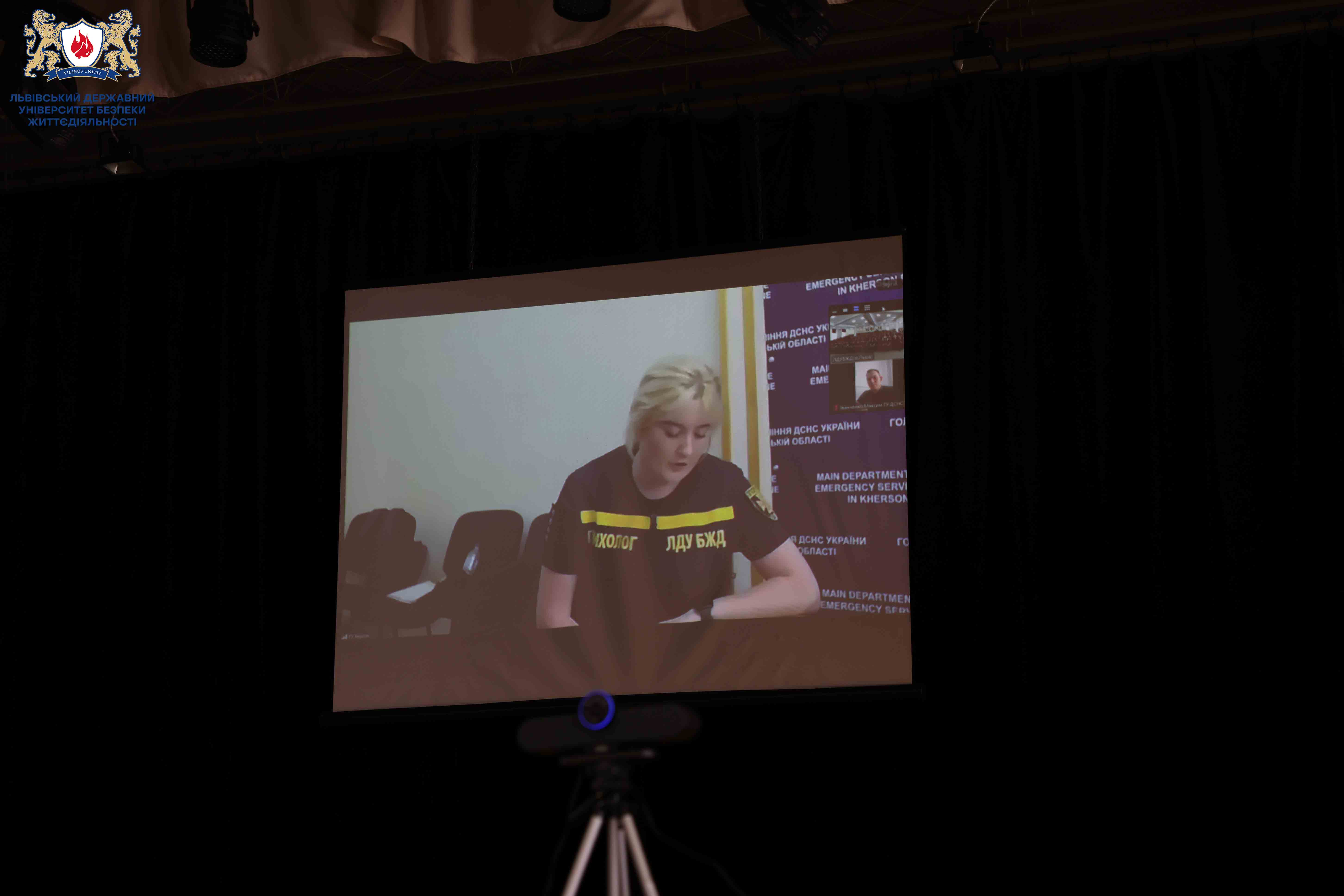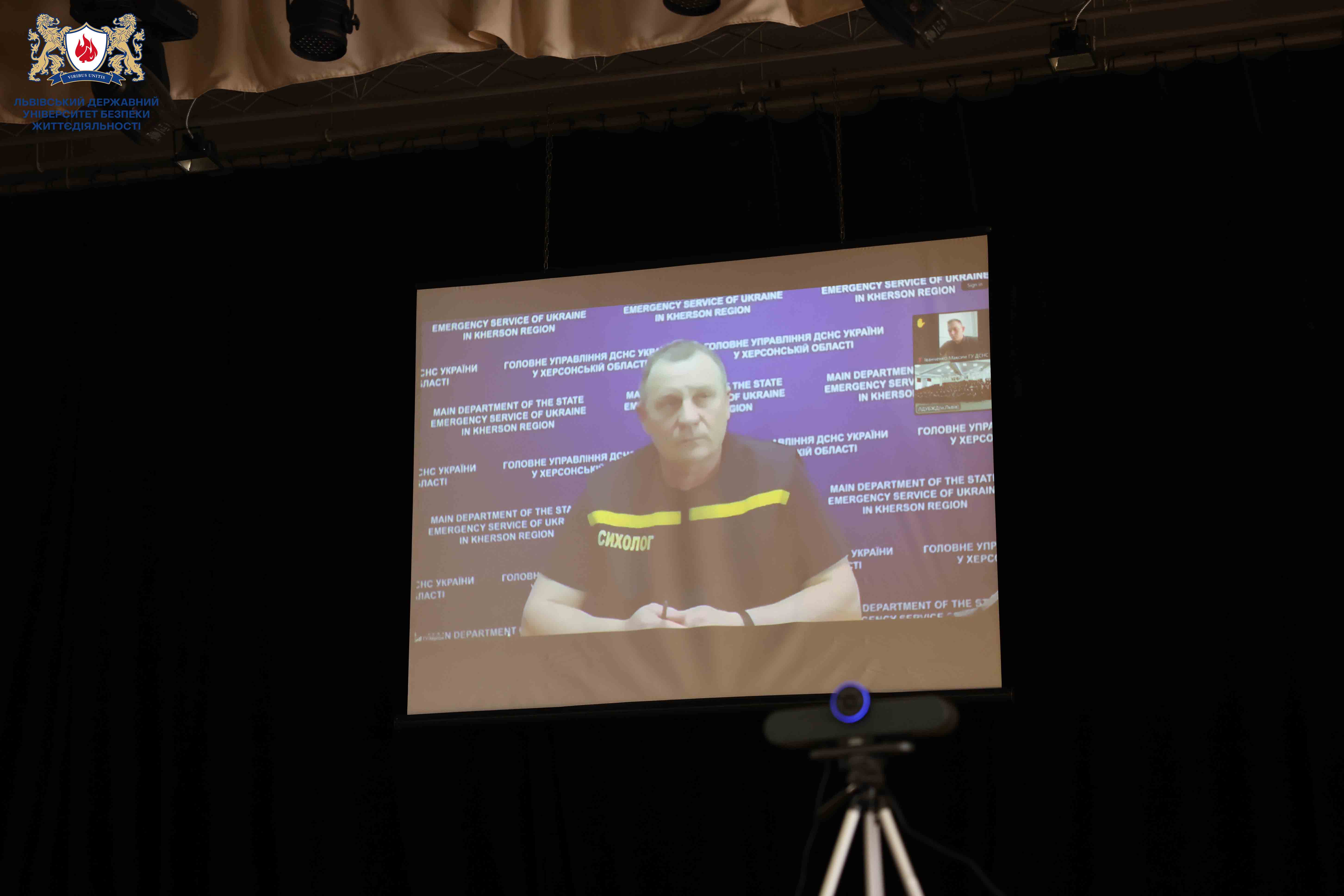 З нагоди Всеукраїнського дня психолога у Львівському державному університеті безпеки життєдіяльності відбулась онлайн-зустріч викладачів та здобувачів вищої освіти із заступником начальника Головного управління Державної служби України з надзвичайних ситуацій у Херсонській області Катериною ГАВРИЛОВОЮ, а також представниками соціально-гуманітарного забезпечення - Дмитром СЄДОВИМ, та психологічного забезпечення — Максимом ІВАНЧЕНКОМ. Також своїм досвідом поділились представники психологічної служби Житомирщини - Ігор ТОЛКАЧ та начальник сектору психологічного забезпечення ЛДУБЖД Христина СУДНІЦИНА, які на даний час проходять службу пліч-о-пліч з рятувальниками Херсонщини. Під час зустрічі фахівці розповіли про складнощі та виклики, з якими стикаються психологи ДСНС під час роботи у прифронтових регіонах. Розповіли про роботу тих, хто надає першу психологічну допомогу, стає емоційним провідником для людей у надскладних обставинах та подіях, під час активних обстрілів та в мирний час, тих хто допомагає під час евакуацій людей з небезпечних територій та районів, що постраждали під час підриву Каховської ГЕС. Слухачів ознайомлено з важливістю підтримки психоемоційного стану та підвищення психологічної готовності особового складу, з напрямками роботи, що охоплює підтримку поранених працівників ДСНС, супроводження родин загиблих рятувальників, а також реалізацією інших завдань, поставлених перед психологічною службою ДСНС України.