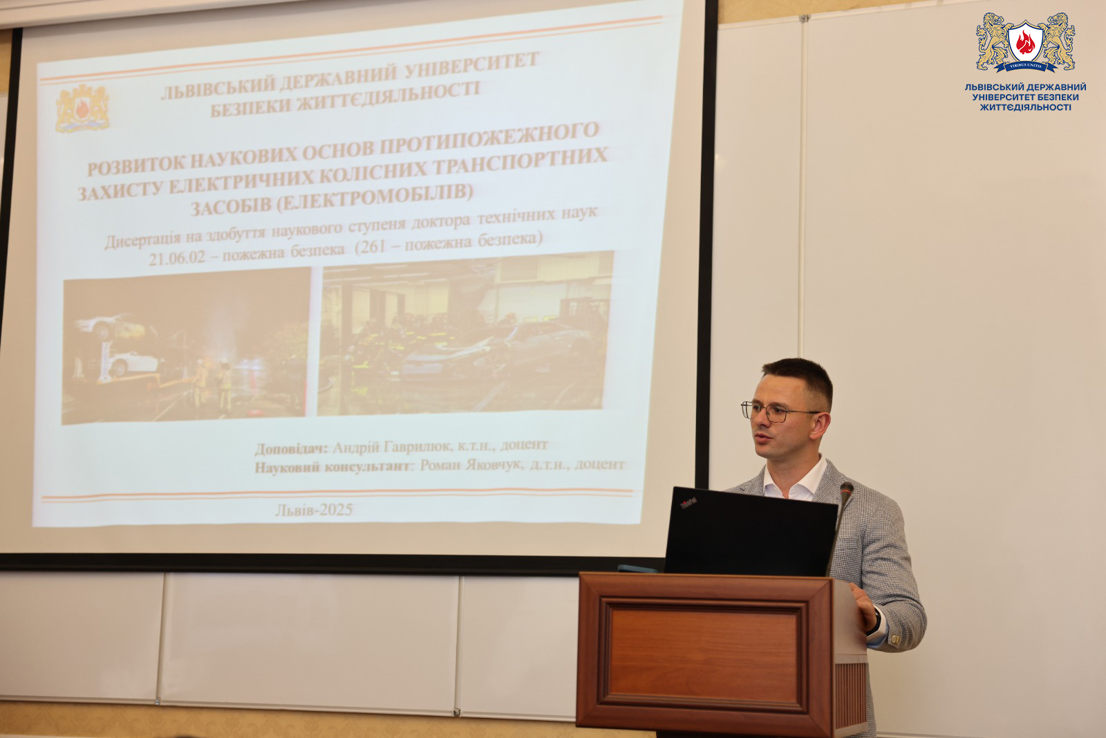 У Львівському державному університеті безпеки життєдіяльності на засіданнях спеціалізованої вченої ради Д 35.874.01 відбулися успішні захисти дисертацій на здобуття наукового ступеня доктора технічних наук: 12 травня 2025 року захист дисертації ГАВРИЛЮКА Андрія Федоровича (Львівський державний університет безпеки життєдіяльності) на тему: “Розвиток наукових основ протипожежного захисту електричних колісних транспортних засобів (електромобілів)” за спеціальністю 21.06.02 – пожежна безпека; 13 травня 2025 року захист дисертації МАЛАНЧУК Оксани Михайлівни (Львівський національний медичний університет імені Данила Галицького) на тему: “Методологія адаптивно-ціннісного управління проєктами розвитку медичних закладів у госпітальних округах” за спеціальністю 05.13.22 – управління проєктами та програмами. Бажаємо науковцям натхнення, сили та творчих успіхів!