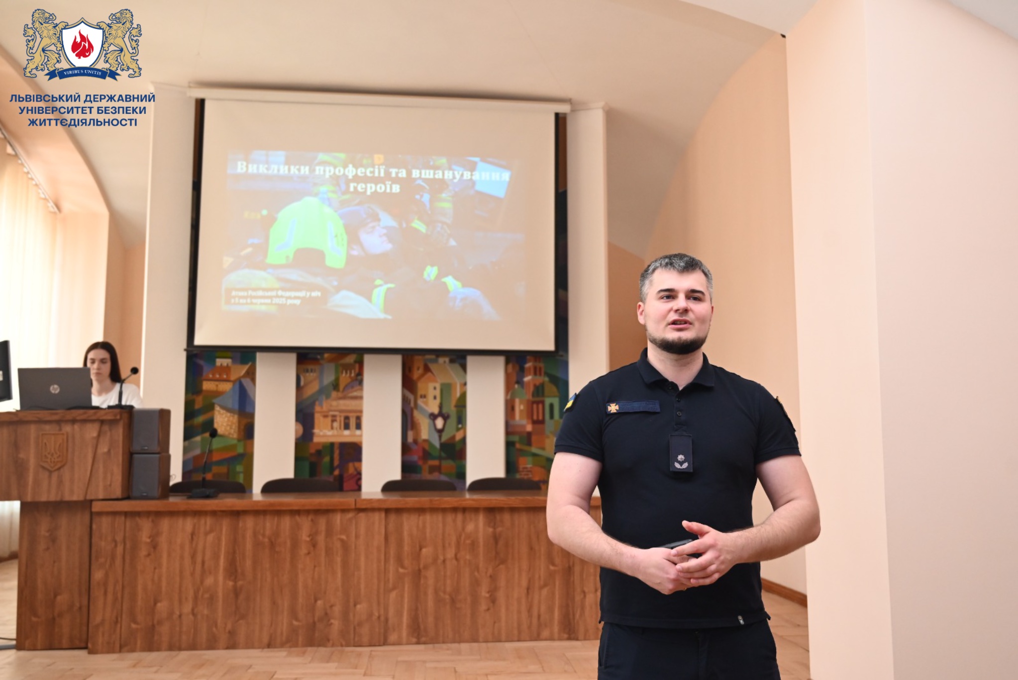 У Львівському державному університеті безпеки життєдіяльності відбулася особлива бесіда, яка не залишила байдужим жодного з присутніх. Захід був присвячений трагічним наслідкам сьогоднішніх обстрілів, у результаті яких загинули рятувальники, виконуючи свій професійний обов’язок — рятуючи інших.