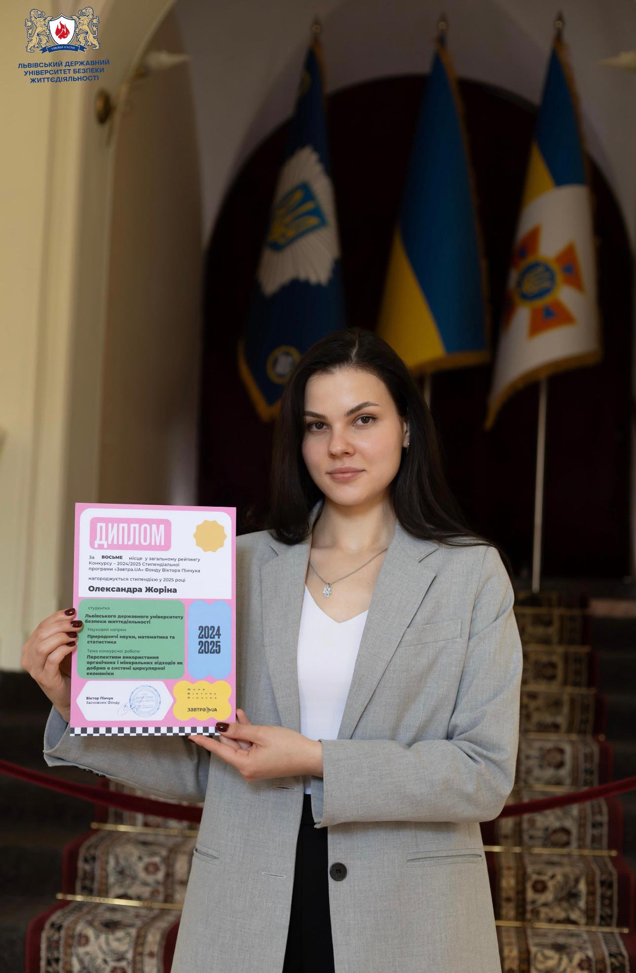 Представниця Львівського державного університету безпеки життєдіяльності, випускниця магістратури за спеціальністю 101 «Екологія» Олександра Жоріна стала стипендіаткою 19-го Всеукраїнського конкурсу стипендіальної програми «Завтра.UA» Фонду Віктора Пінчука.