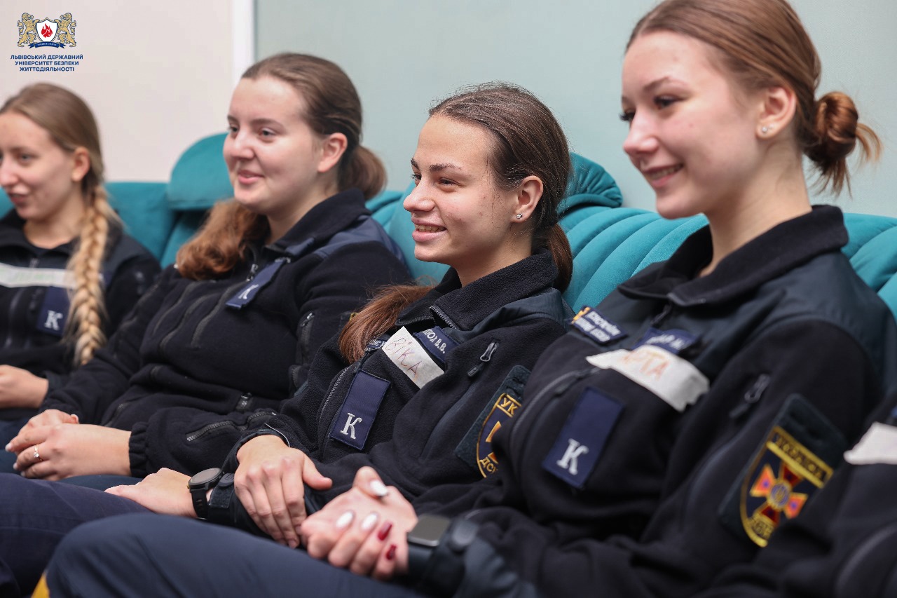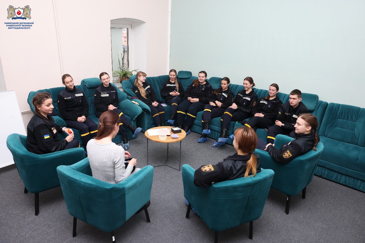 Здобувачі вищої освіти з великим інтересом спілкувалися з фахівчинею, ставили запитання щодо особливостей роботи психолога з рятувальниками в умовах воєнного часу, а також дізнавалися про методи відновлення психоемоційного стану працівників після виконання завдань.