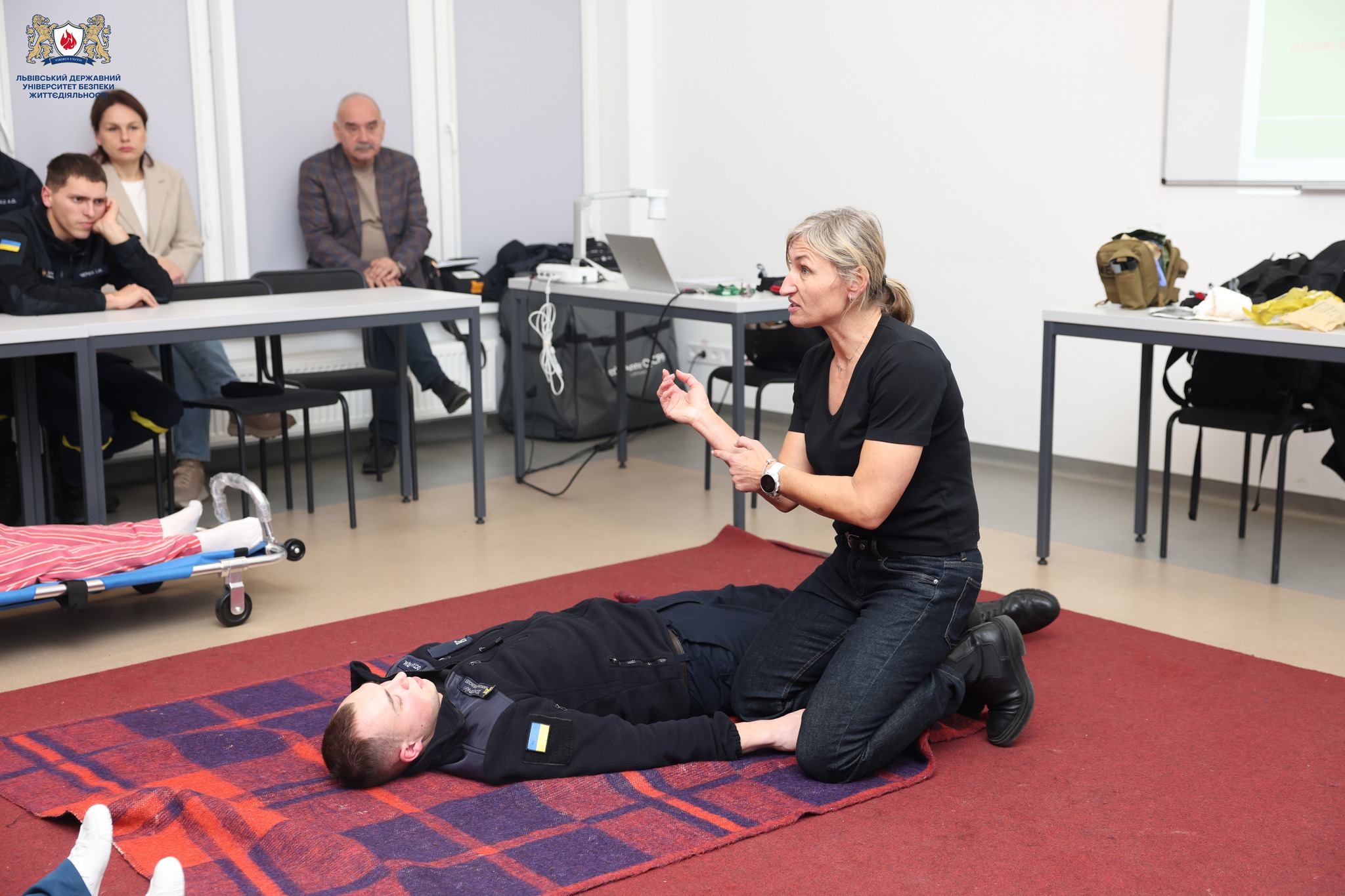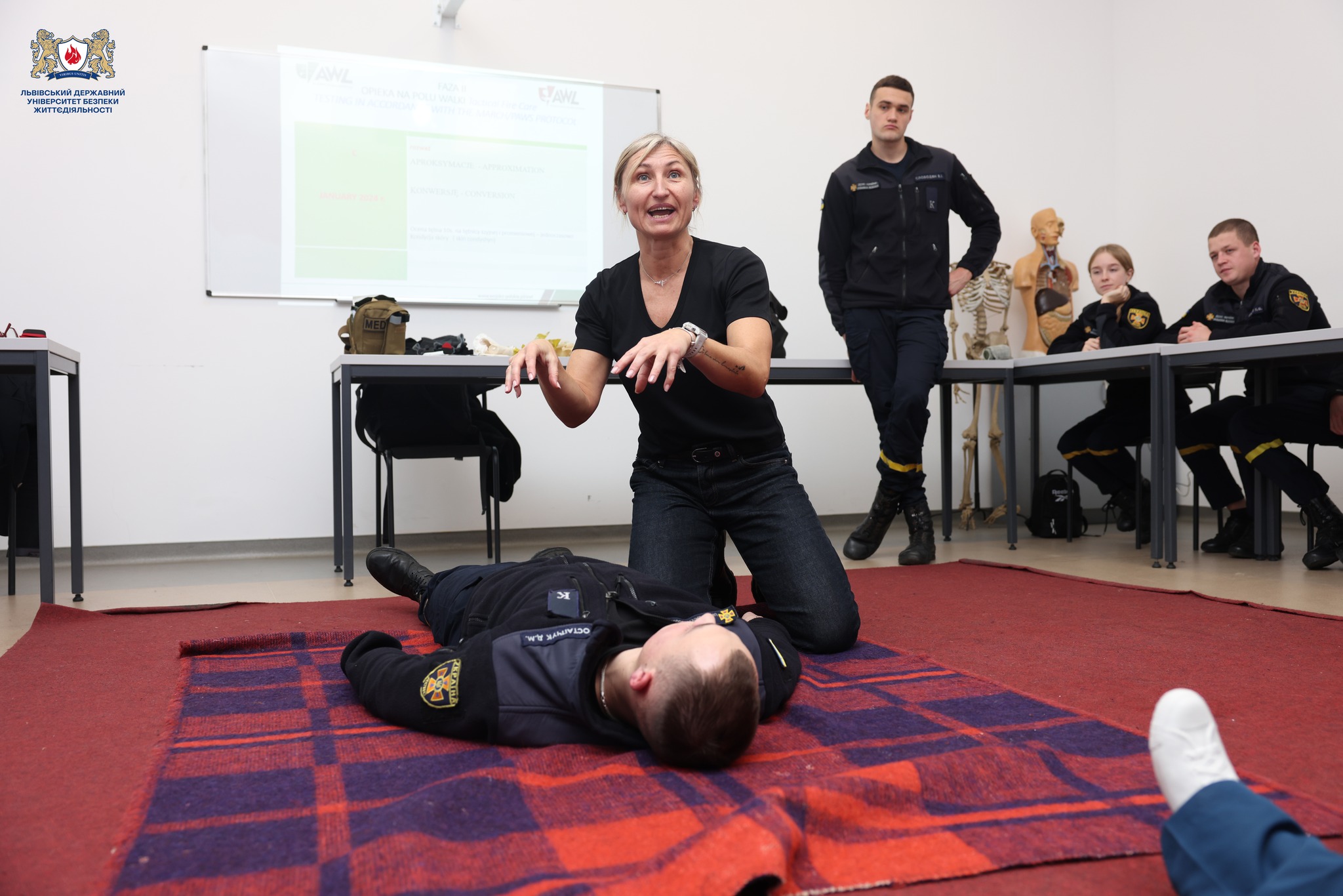 Цього тижня для курсантів 4 курсу Навчально-наукового інституту пожежної та техногенної безпеки та працівників ДСНС України відбулося заняття з тактичної медицини, яке провела пані Беата Зисяк-Кріст (Beata Zysiak-Christ) у межах співпраці з кафедрою домедичної підготовки Інституту післядипломної освіти Львівського державного університету безпеки життєдіяльності.