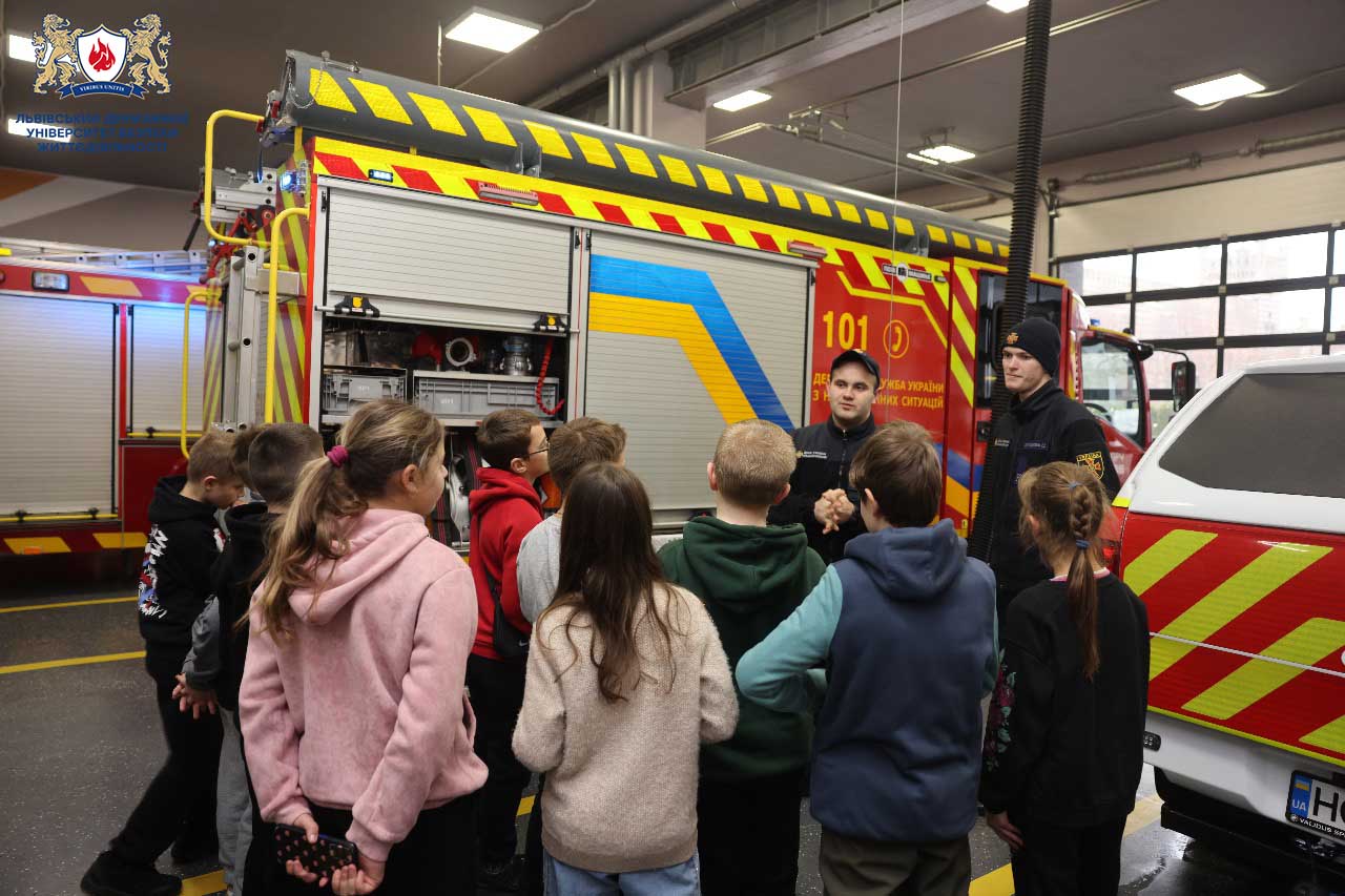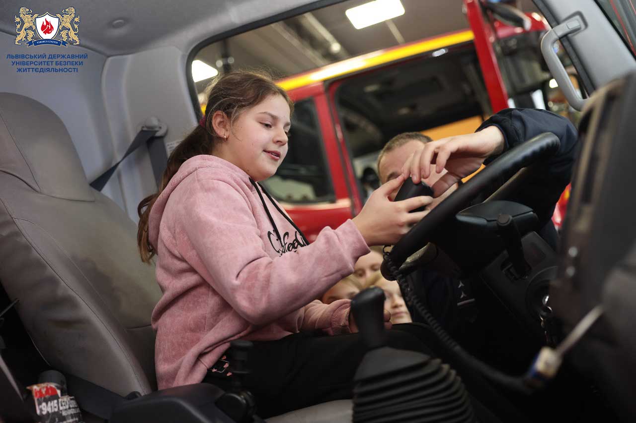 Під час екскурсії діти приміряли пожежні каски та спеціальний одяг, побували в кабіні пожежного автомобіля та ознайомилися із сучасною технікою, що використовується для оперативного реагування на надзвичайні ситуації.