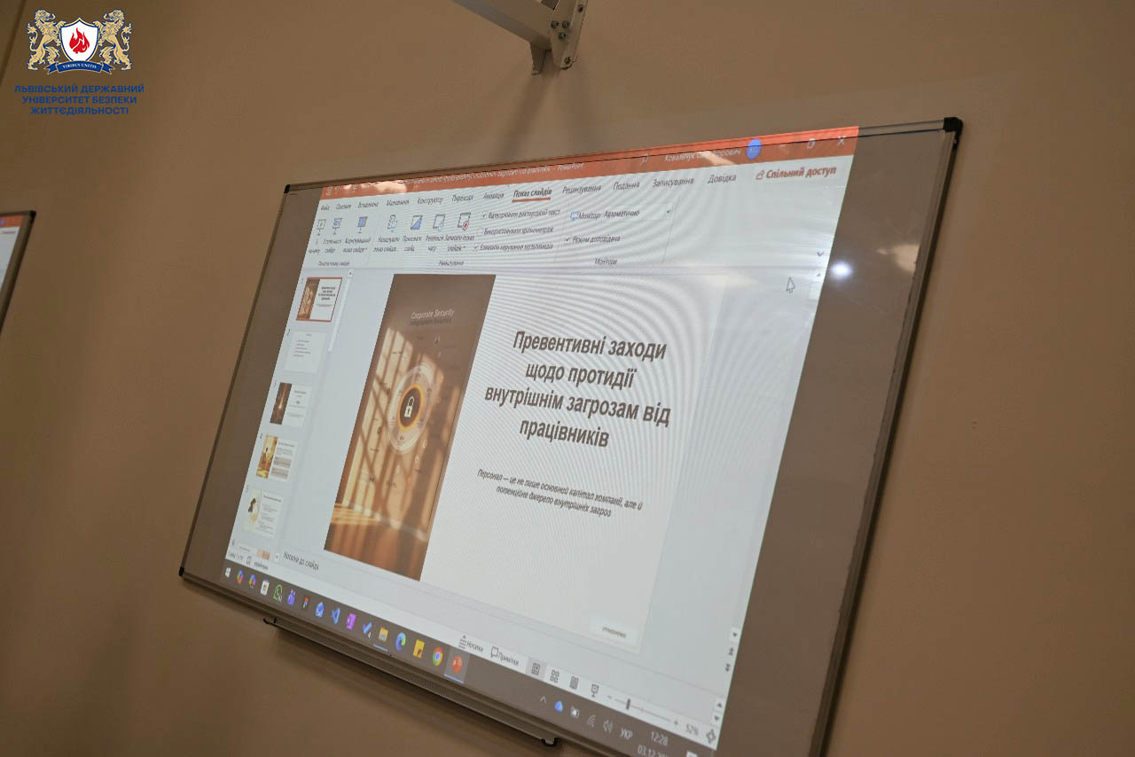 В рамках освітнього процесу та зміцнення співпраці з провідними фахівцями галузі в навчально-науковому інституті пожежної та техногенної безпеки на кафедрі права та менеджменту у сфері цивільного захисту зі здобувачами спеціальності D3 Менеджмент відбулася гостьова лекція з дисципліни «Превентивні стратегії забезпечення кадрової безпеки організації».
