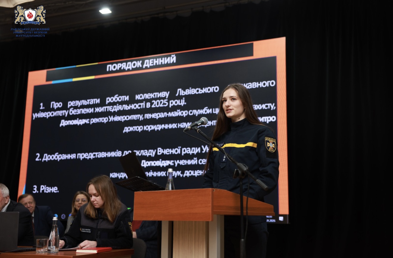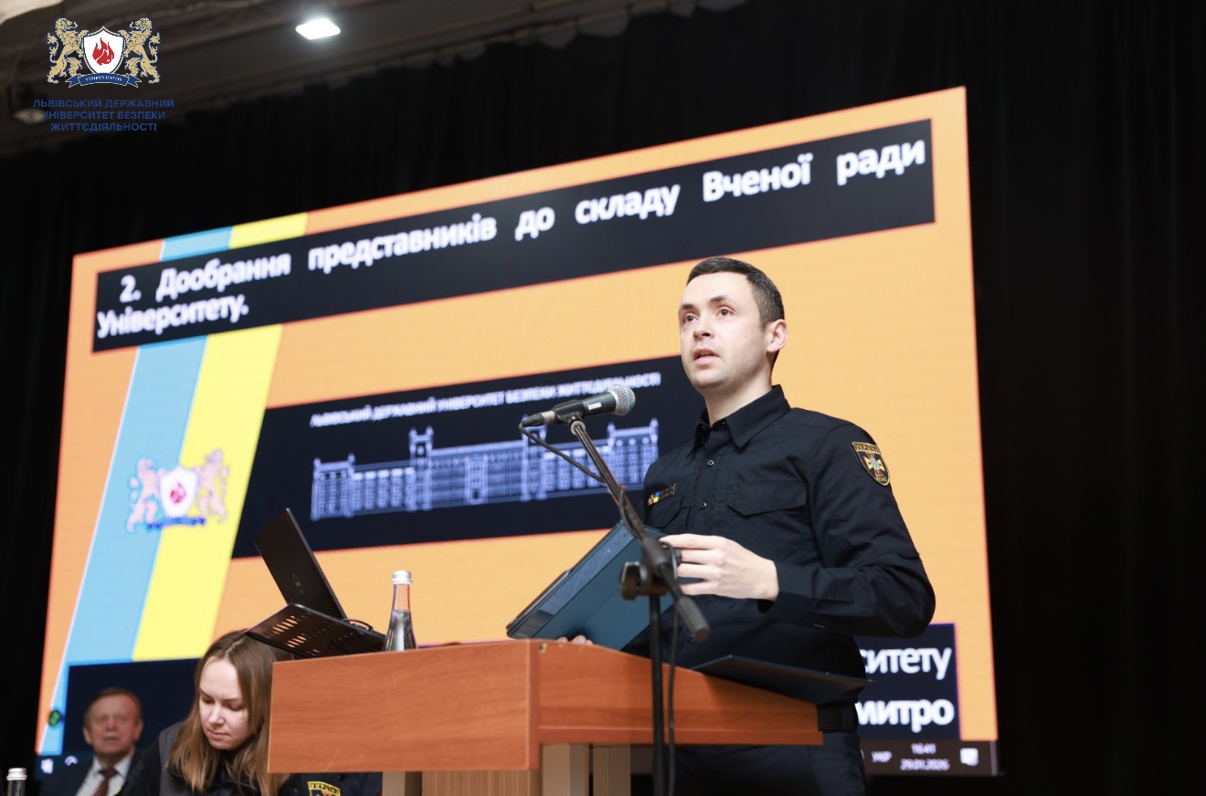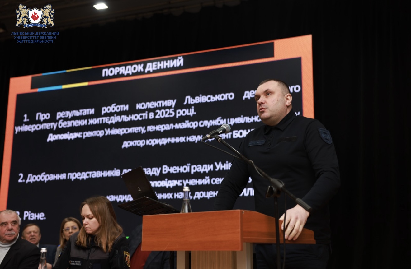 Учасники Конференції затвердили порядок денний, що передбачав розгляд двох питань, першим з яких була доповідь ректора Університету генерал-майор служби цивільного захисту, доктора юридичних наук, доцента, Заслуженого працівника цивільного захисту України Дмитра БОНДАРЯ про результати роботи колективу Львівського державного університету безпеки життєдіяльності в 2025 році. У своїй доповіді Дмитро Володимирович відзначив значний поступ Університету у науковій, освітній, міжнародній царинах, відтак за підсумками 2025 р. наш заклад вищої освіти посідає високі місця у рейтингу ЗВО системи МВС України. З-поміж численних досягнень за звітний період Дмитро Бондар відзначив, що в ЛДУБЖД створено нові кафедри, лабораторії, оновлено матеріально-технічну базу, започатковано нові освітні програми безпекового спрямування, реалізовано ряд міжнародних проєктів та програм, продовжено рейтингування здобувачів освіти, що мотивує їх навчальну, наукову, спортивну активність, про що свідчать призові місця курсантів і студентів ЛДУБЖД у наукових конкурсах та спортивних змаганнях. Упродовж 2025 р. також відбулась низка міжнародних, всеукраїнських науково-практичних конференцій, безпекових тренінгів, реалізовані актуальні в умовах воєнних викликів ініціативні науково-дослідні теми.
