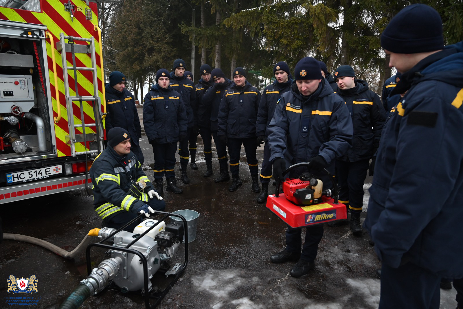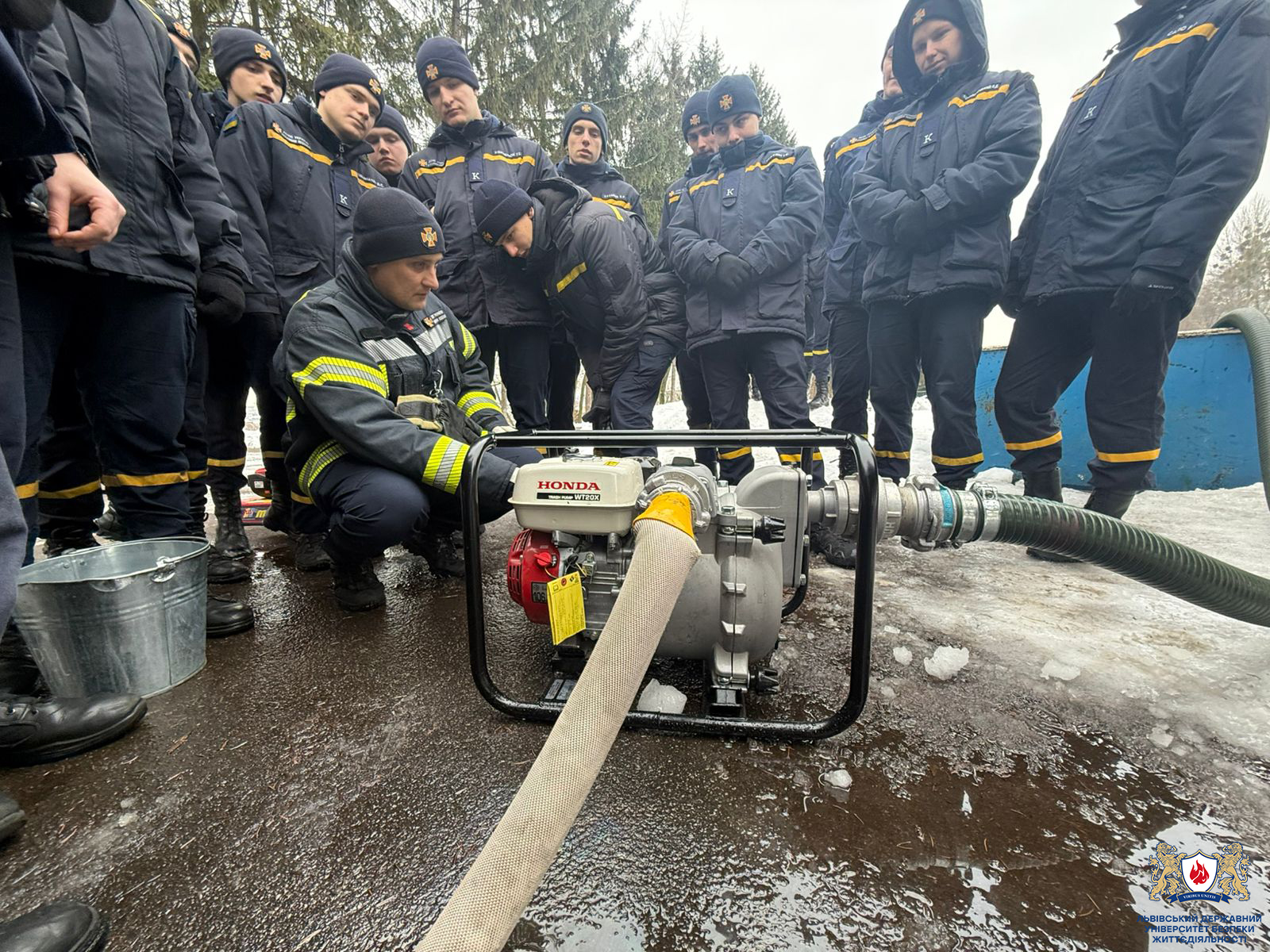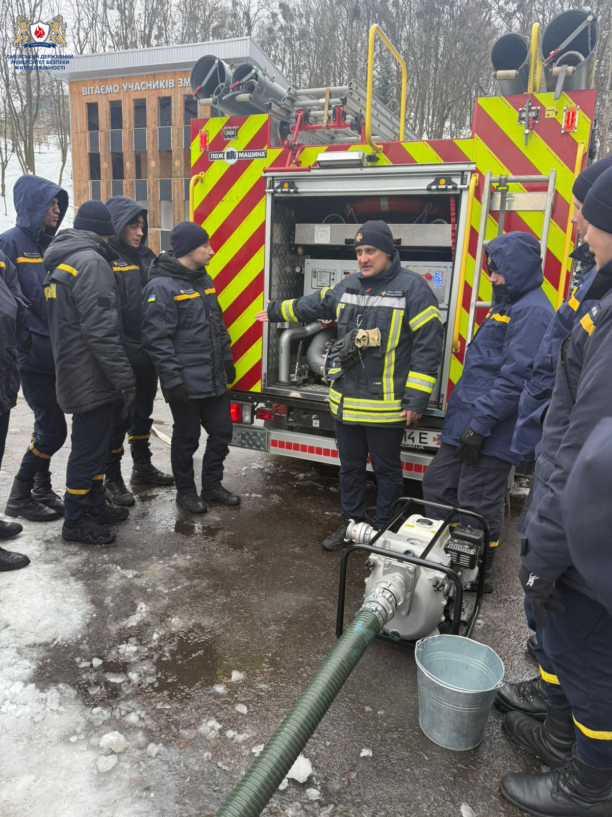 Практичні заняття були спрямовані на відпрацювання вправ під час роботи з насосним устаткуванням пожежної автоцистерни та мотопомпами в умовах низьких температур навколишнього середовища. Особливу увагу приділено особливостям експлуатації техніки в зимовий період, дотриманню вимог безпеки праці та забезпеченню безперебійної роботи обладнання.