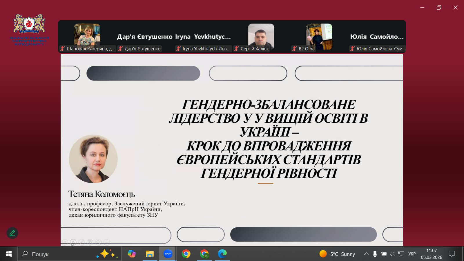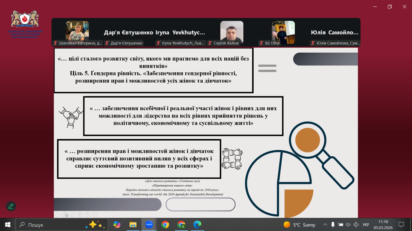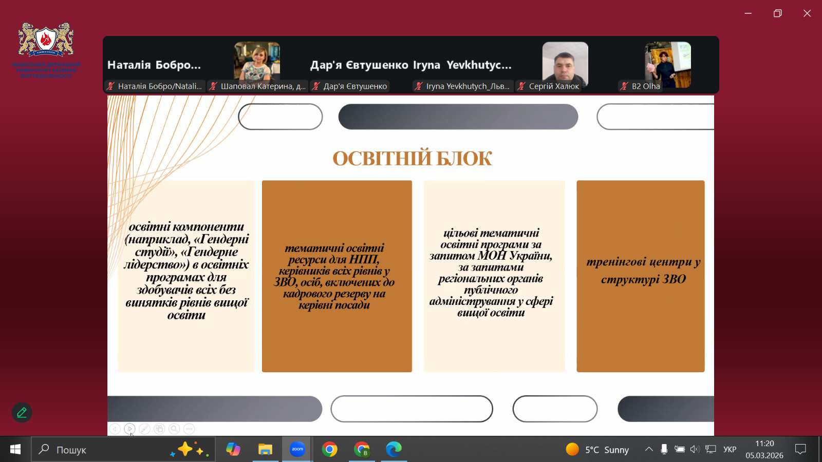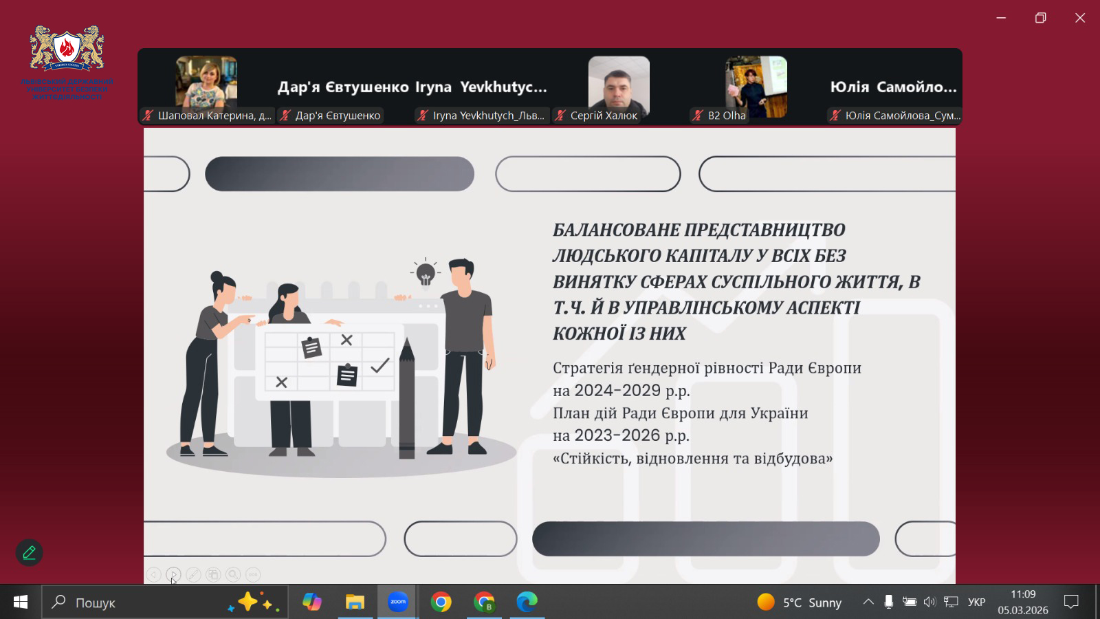 Представниця Львівського державного університету безпеки життєдіяльності взяла участь у круглому столі «Реалізація гендерної політики в умовах Євроінтеграції: досягнення, виклики, перспективи розвитку», який відбувся 5 березня 2026 року у змішаному форматі. Захід організовано Донецьким державним університетом внутрішніх справ спільно з громадськими та експертними організаціями у сфері гендерної політики.