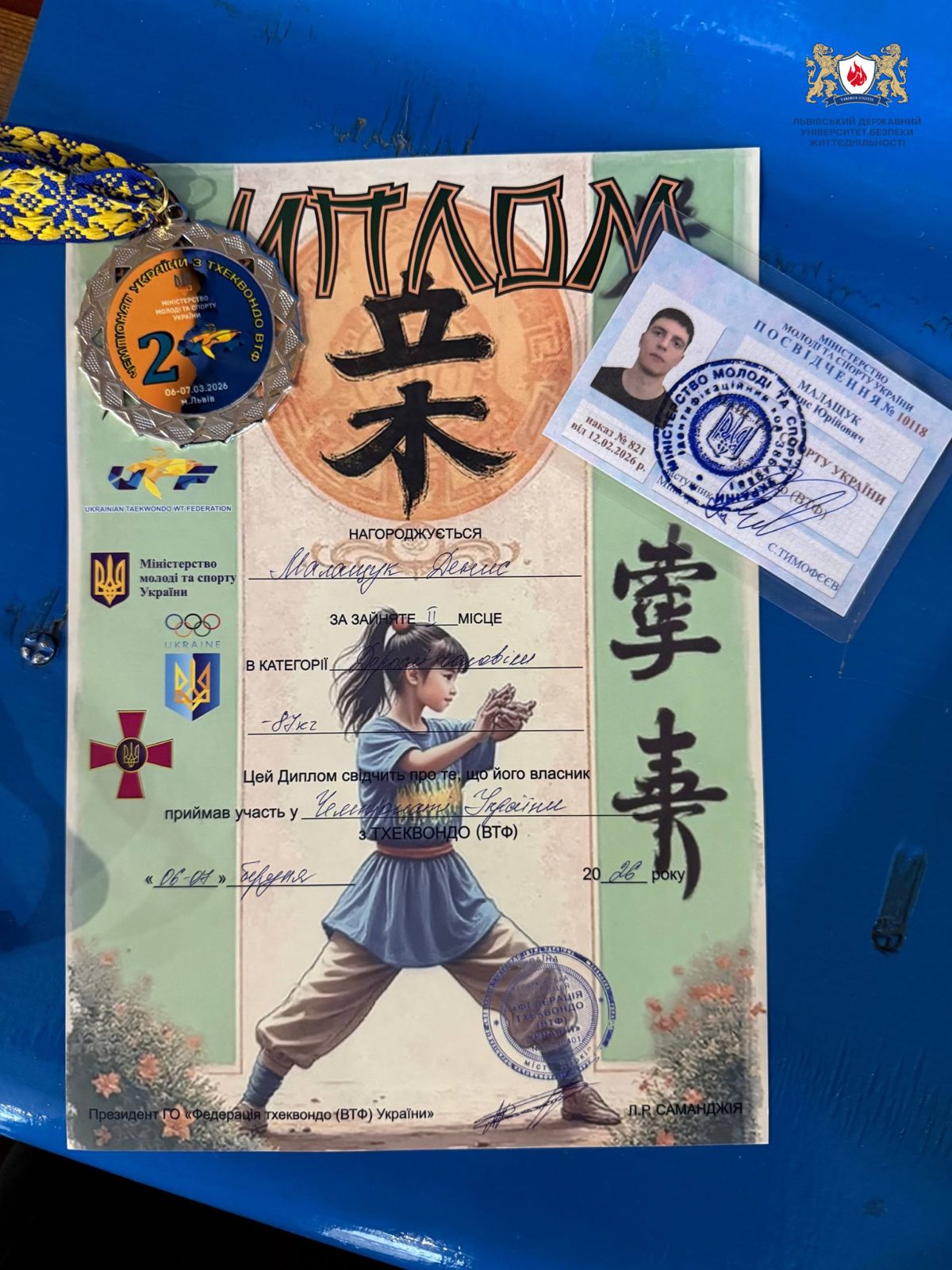 6–7 березня 2026 року курсант 2-го курсу навчально-наукового інституту цивільного захисту Львівського державного університету безпеки життєдіяльності Денис Малащук виборов 2 місце на чемпіонаті України з тхеквондо (ВТФ), який відбувся у місті Львові.